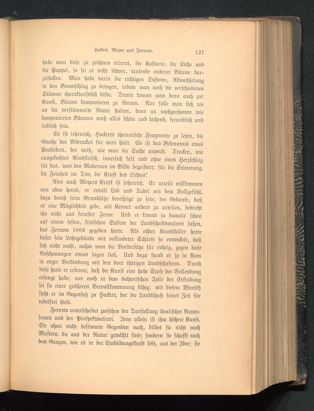 Es ist lehrreich, Hackerts theoretische Fragmente zu lesen, dieGoethe des Abdruckes für wert hielt. Es ist das Bekenntnis einesPraktikers, der weiß, wie man die Sache anpackt. Trocken, wieausgekochtes Rindfleisch, innerlich kalt uud ohne einen Herzschlagfür das, was den Modernen im Bilde begeistert; für die Stimmung,die Feinheit im Tou, die Kraft des Lichtes!