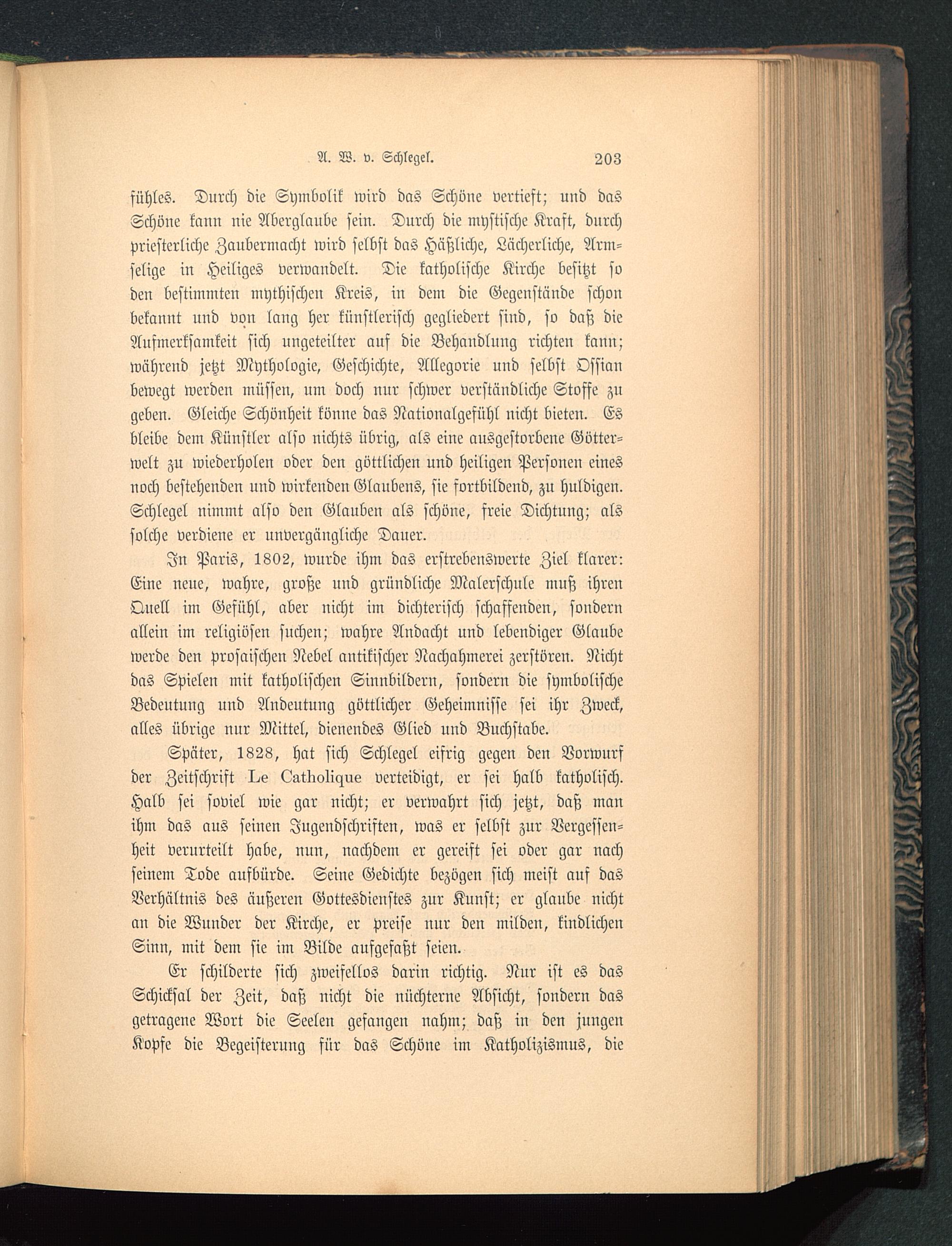 fühles. Durch die Symbolik wird das Schöne vertieft; und dasSchöne kann nie Aberglaube sein. Durch die mystische Kraft, durchpriesterliche Zaubermacht wird selbst das Häßliche, Lächerliche, Arm-selige in Heiliges verwandelt. Die katholische Kirche besitzt soden bestimmten mythischen Kreis, in dem die Gegenstände schonbekannt und von lang her künstlerisch gegliedert sind, so daß dieAufmerksamkeit sich ungeteilter auf die Behandlung richten kann;während jetzt Mythologie, Geschichte, Allegorie und selbst Ossianbewegt werden müssen, um doch nur schwer verständliche Stoffe zugeben. Gleiche Schönheit könne das Nationalgefühl nicht bieten. Esbleibe dem Künstler also nichts übrig, als eine ausgestorbene Götter-welt zu wiederholen oder den göttlichen und heiligen Personen einesnoch bestehenden und wirkenden Glaubens, sie fortbildend, zu huldigen.Schlegel nimmt also den Glauben als schöne, sreie Dichtung; alssolche verdiene er unvergängliche Dauer.