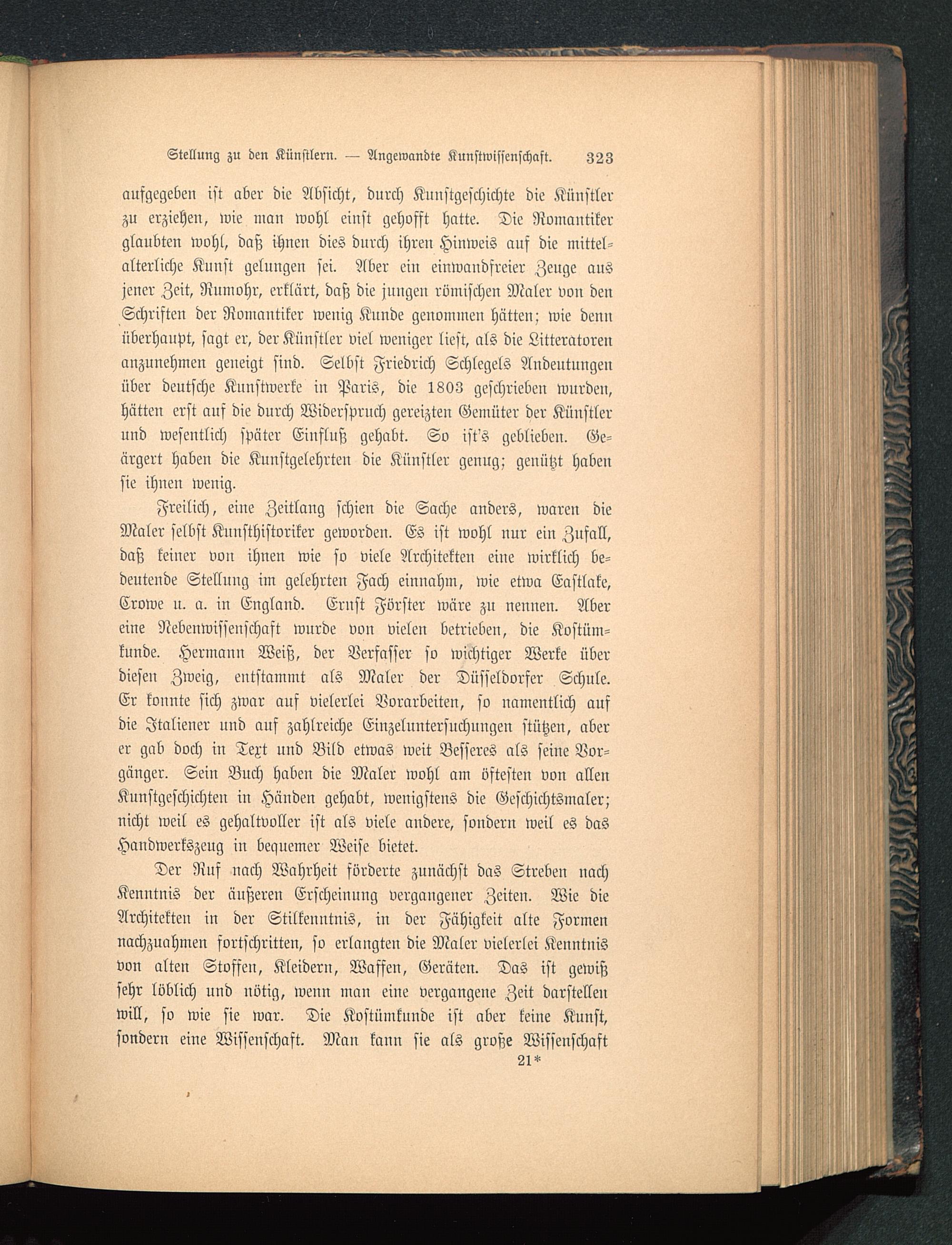 Freilich, eilte Zeitlang schien die Sache anders, waren dieMaler selbst Kunsthistoriker geworden. Es ist wohl nur ein Zufall,daß keiner von ihnen wie so viele Architekten eine wirklich be-deuteude Stellung im gelehrten Fach einnahm, wie etwa Eastlake,Crowc u. a. in England. Ernst Förster wäre zn nennen. Abereine Nebenwissenschaft wurde von vielen betrieben, die Kostüm-kunde. Hermann Weiß, der Verfasser so wichtiger Werke überdiesen Zweig, entstammt als Maler der Düsseldorfer Schule.Er konnte sich zwar auf vielerlei Vorarbeiten, so namentlich aufdie Italiener und auf zahlreiche Einzeluntersuchungen stützen, aberer gab doch in Text und Bild etwas weit Besseres als seine Vor-gänger. Sein Buch haben die Maler wohl am öftesten von allenKunstgeschichten in Händen gehabt, wenigstens die Geschichtsmaler;nicht weil es gehaltvoller ist als viele andere, sondern weil es dasHandwerkszeug iu bequemer Weise bietet.