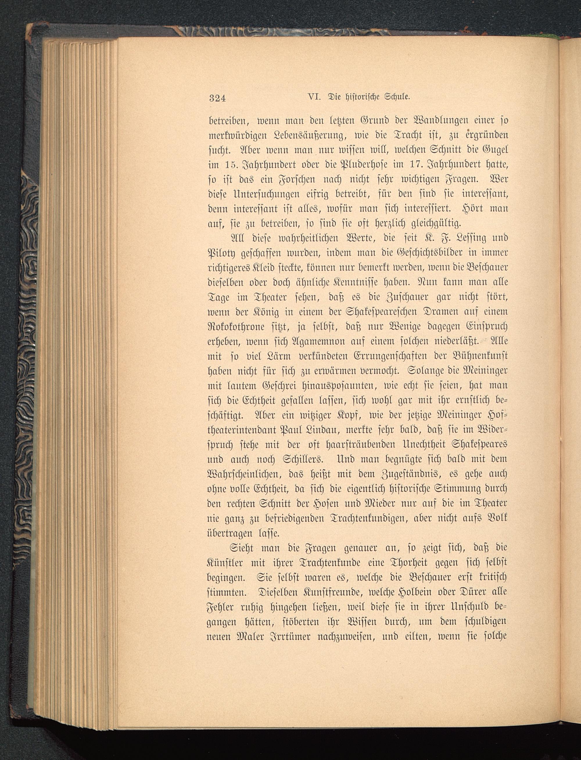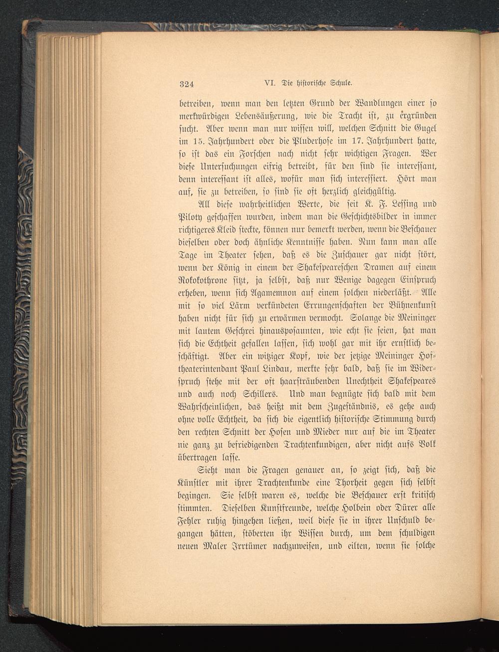 All diese wahrheitlichen Werte, die seit K. F. Lessiug undPiloty geschaffen wurden, iudeiu mau die Geschichtsbilder in immerrichtigeres Kleid steckte, können nnr bemerkt wcrdeu, weuu die Beschauerdieselben oder doch ähnliche Kenntnisse haben. Nnn kann man alleTage im Theater sehen, daß es die Zuschaner gar nicht stört,wenn der König in einem der Shakespeareschen Dramen ans einemRokokothrone sitzt, ja selbst, daß nur Wenige dagegen Einsprucherheben, wenn sich Agamemnon ans einem solchen niederläßt. Allemit so viel Lärm verküudeteu Errungenschaften der Bühnenknnsthaben nicht für sich zu erwärmen vermocht. Solange die Meiningermit lautem Geschrei hinausposauuteu, wie echt sie feieu, hat mansich die Echtheit gefallen lassen, sich wohl gar mit ihr ernstlich be-schäftigt. Aber ein witziger Kopf, wie der jetzige Meininger Hof-theaterintendant Paul Lindau , merkte sehr bald, daß sie im Wider-spruch stehe mit der oft haarsträubenden Unechtheit Shakespearesnnd auch uoch Schillers. Und man begnügte sich bald mit demWahrscheinlichen, das heißt mit dem Zugeständnis, es gehe auchohne volle Echtheit, da sich die eigentlich historische Stimmuug durchden rechten Schnitt der Hosen und Mieder nur auf die im Theaternie ganz zu befriedigenden Trachtenknndigen, aber nicht aufs Volkübertragen lasse.