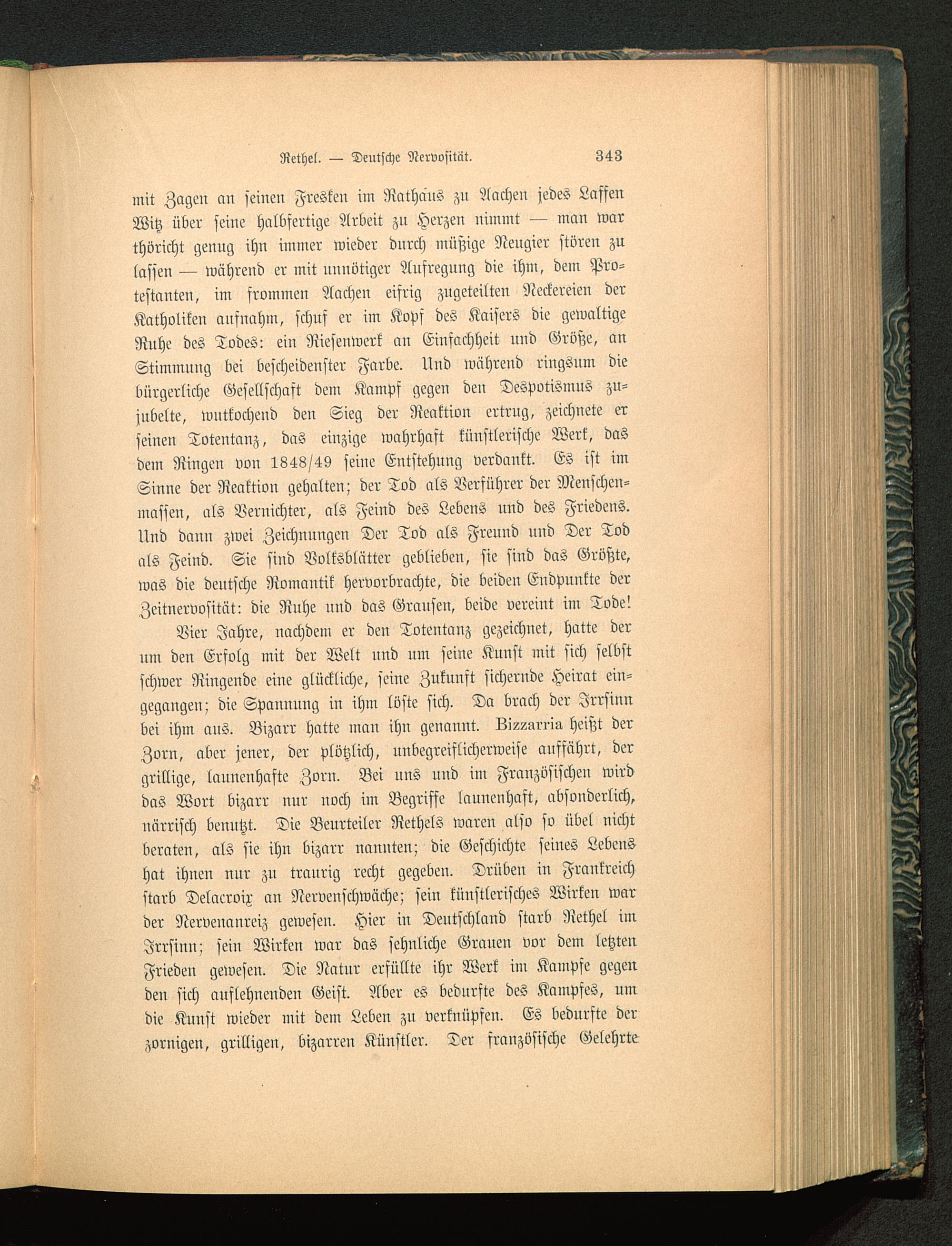 Vier Jahre, nachdem er den Totentanz gezeichnet, hatte derum den Erfolg mit der Welt und um seine Kunst mit sich selbstschwer Ringende eine glückliche, seine Zukunft sichernde Heirat ein-gegangen; die Spannung in ihm löste sich. Da brach der Irrsinnbei ihm aus. Bizarr hatte man ihn genannt. Li/^ariia heißt derZorn, aber jener, der plötzlich, nnbegreiflicherweise auffährt, dergrillige, launenhafte Zorn. Bei uns und im Französischen wirddas Wort bizarr nur «och im Begriffe launenhaft, absonderlich,närrisch benutzt. Die Beurteiler Rethels waren also so übel nichtberaten, als sie ihn bizarr nannten; die Geschichte seines Lebenshat ihnen nur zu traurig recht gegeben. Drübeu in Frankreich starb Delacroix an Nervenschwäche; sein künstlerisches Wirken warder Nervenanreiz gewesen. Hier in Deutschland starb Rethel imIrrsinn; seiu Wirken war das sehnliche Grauen vor dem letztenFrieden gewesen. Die Natur erfüllte ihr Werk im Kampfe gegenden sich auslehnenden Geist. Aber es bedürfte des Kampfes, umdie Kunst wieder mit dem Leben zu verknüpfen. Es bedürfte derzornigen, grilligen, bizarren Künstler. Der französische Gelehrte