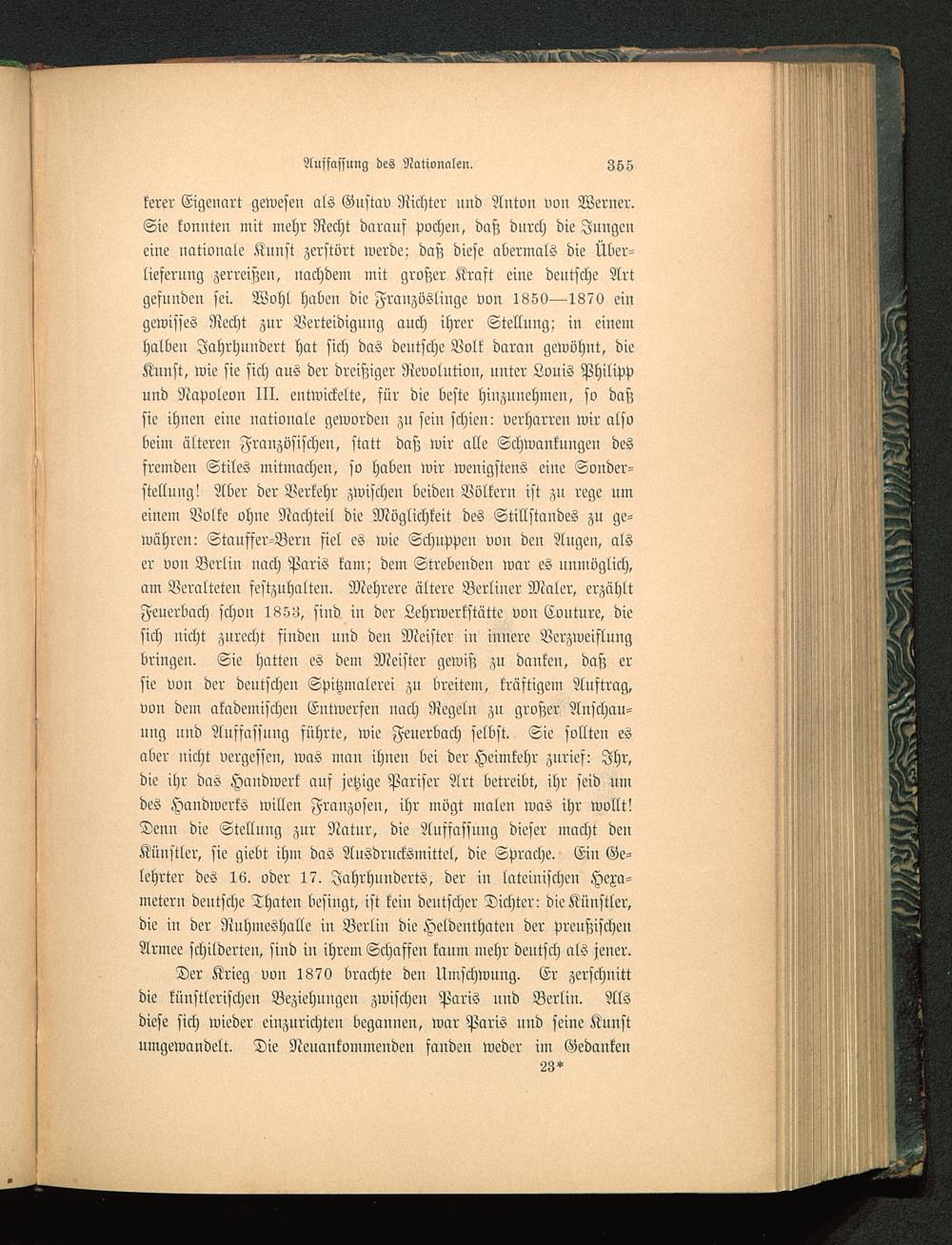 kerer Eigenart gewesen als Gustav Richter und Anton von Werner .Sie konnten mit mehr Recht darauf pochen, daß durch die Jungeueine nationale Kunst zerstört werde; daß diese abermals die Über-lieferung zerreißen, nachdem mit großer Kraft eine deutsche Artgefunden sei. Wohl haben die Französlinge von 1850—1870 eingewisses Recht zur Verteidigung auch ihrer Stellung; in einemhalben Jahrhundert hat sich das deutsche Volk darau gewöhnt, dieKnnst, wie sie sich aus der dreißiger Revolution, unter Louis Philipp und Napoleon III. entwickelte, für die beste hinzunehmen, so daßsie ihnen eine nationale geworden zu sein schien: verharren wir alsobeim älteren Französischen, statt daß wir alle Schwankungen desfremden Stiles mitmachen, so haben wir wenigstens eine Sonder-stellung! Aber der Verkehr zwischen beiden Völkern ist zu rege umeinem Volke ohne Nachteil die Möglichkeit des Stillstandes zu ge-währen: Stauffer-Bern fiel es wie Schuppen von den Augen, alser vou Berlin nach Paris kam; dem Strebenden war es unmöglich,am Veralteten festzuhalten. Mehrere ältere Berliner Maler, erzähltFeuerbach schon 1853, sind in der Lehrwerkstätte von Couture, diesich nicht zurecht finden und den Meister in innere Verzweiflungbringen. Sie hatten es dem Meister gewiß zu danken, daß ersie von der deutschen Spitzmalerei zu breitem, kräftigem Auftrag,von dein akademischen Entwerfeu nach Regeln zu großer Anschau-ung und Auffassung führte, wie Feuerbach selbst. Sie sollten esaber nicht vergessen, was mau ihnen bei der Heimkehr zurief: Ihr,die ihr das Handwerk auf jetzige Pariser Art betreibt, ihr seid umdes Handwerks willen Franzosen, ihr mögt malen was ihr wollt!Denn die Stellung zur Natur, die Auffassung dieser macht denKünstler, sie giebt ihm das Ansdrucksmittel, die Sprache. Ein Ge-lehrter des 16. oder 17. Jahrhunderts, der in lateinischen Hexa-metern deutsche Thaten besingt, ist kein deutscher Dichter: die Künstler,die in der Nuhmeshalle in Berlin die Heldenthaten der preußischenArmee schilderten, sind in ihrem Schaffen kaum mehr deutsch als jener.
