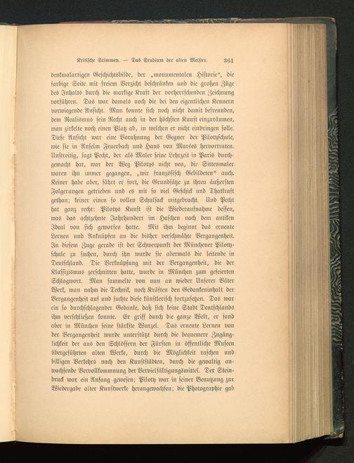 denkmalartigen Geschichtsbilde, der „monumentalen Historie", diesarbige Seite mit freiem Verzicht beschränken nnd die großen Zügedes Inhalts durch die markige Kraft der vorherrschenden Zeichnungvorführen. Das war damals noch die bei den eigentlichen Kennernvorwiegende Ansicht. Man konnte sich noch nicht damit befreunden,dem Realismus seiu Recht auch in der höchsten Kunst einzuräumen,man zirkelte noch eineu Platz ab, in welchen er nicht eindringen solle.Diese Ansicht war eine Vorahnung der Gegner der Pilotyschule,wie sie in Anselm Fenerbach und Hans von Marses hervortraten.Unstreitig, sagt Pecht, der als Maler seine Lehrzeit in Paris durch-gemacht hat, war der Weg Pilotys nicht neu, die Sittenmalerwaren ihn immer gegangen, „Nur französisch Gebildeten" auch.Keiner habe aber, führt er fort, die Grundsätze zu ihren äußerstenFolgerungen getrieben und es mit so viel Geschick und Thatkraftgethan; keiner einen so vollen Schnlsack mitgebracht. Und Pechthat ganz recht: Pilotys Kunst ist die Wiederaufnahme dessen,was das achtzehnte Jahrhundert im Haschen nach dem antikenIdeal von sich geworfen hatte. Mit ihm beginnt das erneuteLernen und Anknüpfen an die bisher verschmähte Vergangenheit.In diesem Zuge gerade ist der Schwerpunkt der Münchener Piloty-schule zu suchen, durch ihn wurde sie abermals die leitende inDeutschland . Die Verknüpfung mit der Vergangenheit, die derKlassizismus zerschnitten hatte, wurde in München znm gefeiertenSchlagwort. Man sammelte von nun an wieder Unserer VäterWerk, man nahm die Technik, nach Kräfteu deu Gedankeninhalt derVergangenheit auf und suchte diese künstlerisch fortzusetzen. Das warein so durchschlagender Gedanke, daß sich keine Stadt Deutschlands ihm verschließen konnte. Er griff durch die ganze Welt, er fandaber in München seine stärkste Wnrzel. Das erneute Lerueu vonder Vergaugeuheit wurde unterstützt durch die bequemere Zugäug-lichkeit der aus den Schlössern der Fürsten in öffentliche Museeuübergeführten alten Werke, dnrch die Möglichkeit raschen undbilligen Verkehrs nach den Kunststädten, durch die gewaltig an-wachsende Vervollkommnung der Vervielfältigungsmittel. Der Stein-druck war eiu Anfang gewesen; Piloty war in seiner Benutzung znrWiedergabe alter Kunstwerke herangewachsen; die Photographie gab