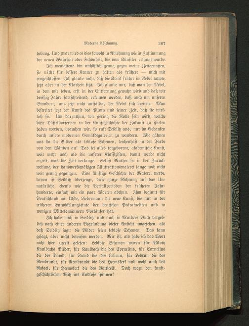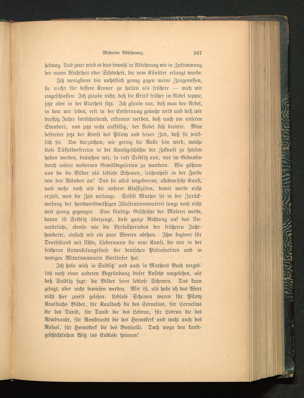 Ich habe mich in Seidlitz' uud auch in Mnthers Buch vergeb-lich nach einer anderen Begründnng dieser Ansicht umgesehen, alsdaß Seidlitz sagt: die Bilder seien leblose Schemen. Das kanngesagt, aber nicht bewiesen werden. Mir ist, als habe ich das Wortnicht hier zuerst gelesen: Leblose Schemen waren für PilotyKaulbachs Bilder, für Kaulbach die des Cornelius, für Corneliusdie des David, für David die des Lebrnn, für Lebrun die desNembrandt, für Rembrandt die des Heemskerk und Wohl auch desRafael, für Heemskerk die des Botticelli . Doch wozu den kunst-geschichtlichen Witz ins Endlose spinnen!