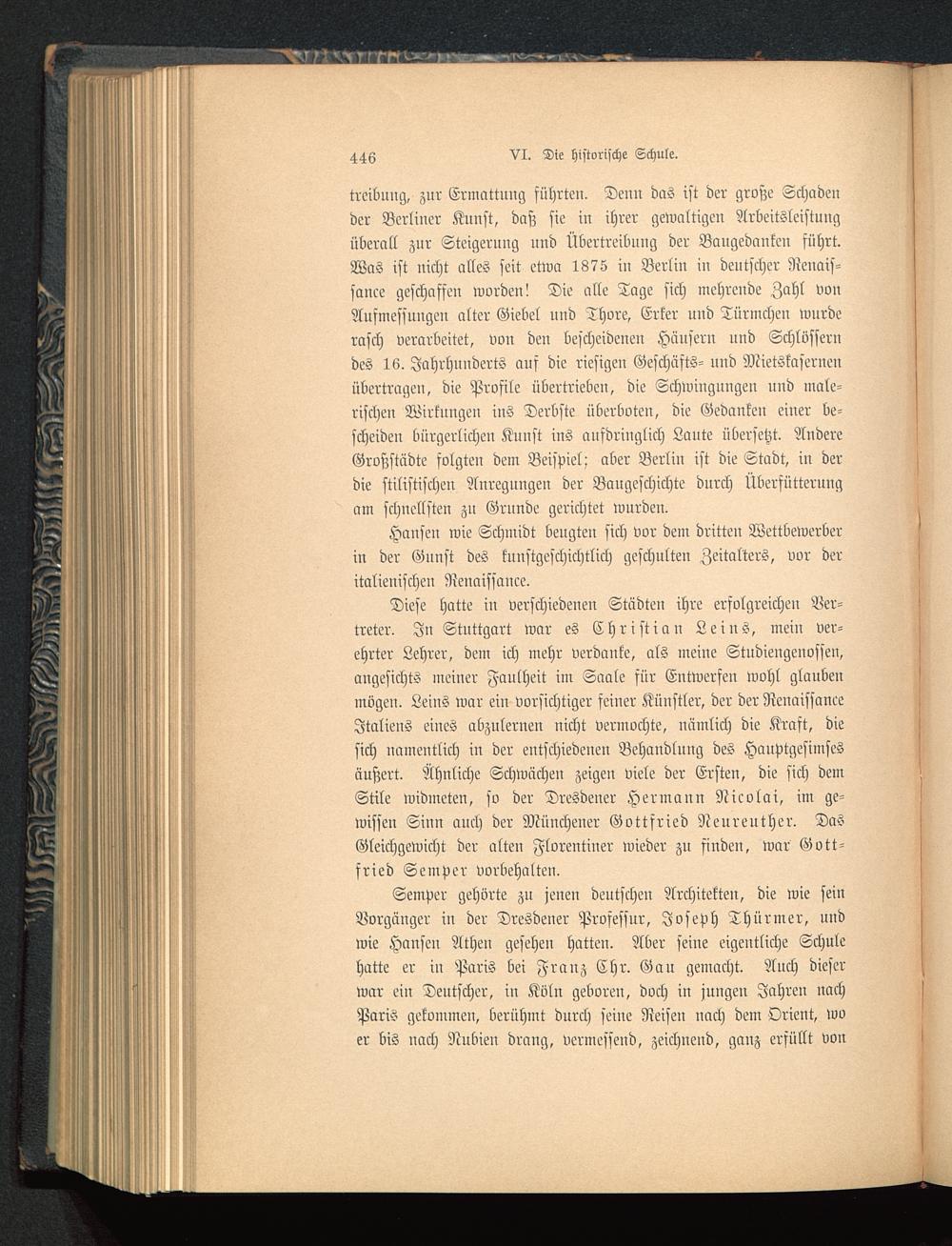 Semper gehörte zn jenen deutschen Architekten, die wie seinVorgänger iu der Dresdener Professur, Joseph Thürmer , undwie Hansen Athen gesehen hatten. Aber seine eigentliche Schulehatte er in Paris bei Franz Chr. Gau gemacht. Auch dieserwar ein Deutscher, in Köln geboren, doch in jungen Jahren nachParis gekommen, berühmt durch seiue Reisen nach dem Orient, woer bis uach Nubieu drang, vermessend, zeichnend, ganz erfüllt von