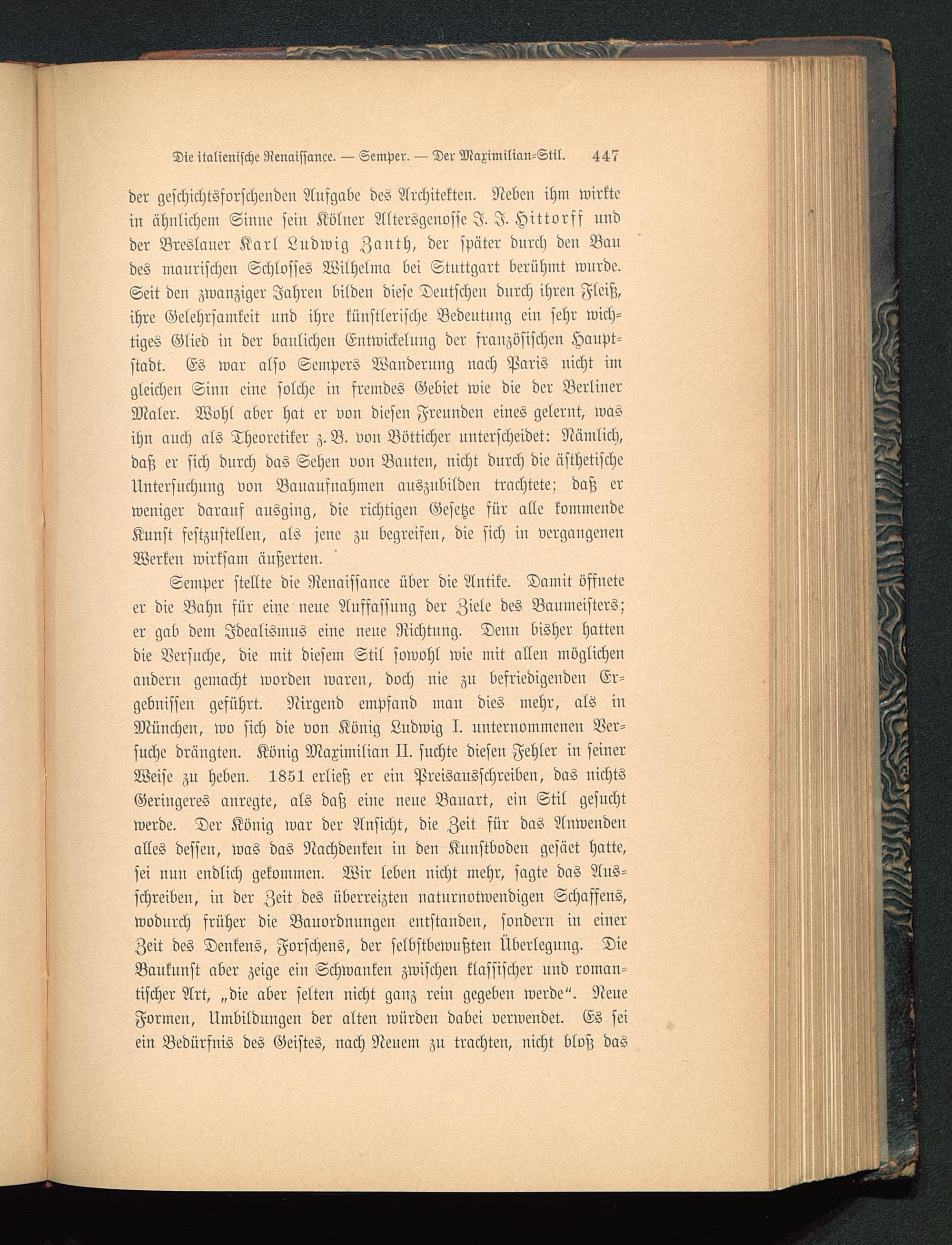 der geschichtsforschenden Aufgabe des Architekten. Neben ihm wirktein ähnlichem Sinne sein Kölner Altersgenosse I. I. Hittvrff undder Breslauer Karl Ludwig Zauth, der später durch deu Baudes maurischen Schlosses Wilhelm« bei Stnttgart berühmt wnrde.Seit den zwanziger Jahren bilden diese Deutschen durch ihren Fleiß,ihre Gelehrsamkeit und ihre künstlerische Bedeutung ein sehr wich-tiges Glied iu der baulichen Entwickelung der französischen Haupt-stadt. Es war also Sempers Wanderung nach Paris nicht inigleichen Sinn eine solche in fremdes Gebiet wie die der BerlinerMaler. Wohl aber hat er von diesen Freunden eines gelernt, wasihn auch als Theoretiker z.B. von Bötticher unterscheidet: Nämlich,daß er sich durch das Sehen von Bauten, nicht durch die ästhetischeUntersuchung von Bauaufnahmen auszubilden trachtete; daß erweniger darauf ausging, die richtigen Gesetze für alle kommendeKunst festzustellen, als jene zn begreifen, die sich in vergangenenWerken wirksam äußerten.