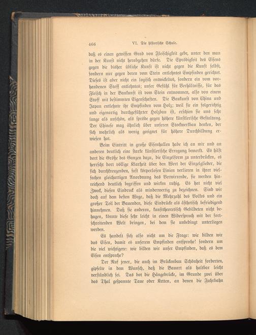 daß es einen gewissen Grad von Fleischigkeit gebe, unter den manin der Kunst nicht herabgehen dürfe. Die Sprödigkeit des Eisensgegen die bisher übliche Kunst ist nicht gegen die Kunst selbst,sondern nur gegen deren vom Stein entlehntes Empfinden gerichtet.Dieses ist aber nicht ein logisch entwickeltes, sondern ein vom vor-handenen Stoff entlehntes; unser Gefühl für Verhältnisse, für dasFleisch in der Baukunst ist vom Stein entnommen, also von einemStoff mit bestimmten Eigenschaften. Die Baukunst von China undJapan entlehnte ihr Empfinden vom Holz; weil sie ein folgerichtigund eigenartig durchgeführter Holzbau ist, erschien sie uns sehrlange als unschön, als spröde gegen höhere künstlerische Gestaltung.Der Chinese mag ähnlich über unseren Stockwerkbau denken, dersich wahrlich als wenig geeignet für höhere Durchbilduug er-wiesen hat.