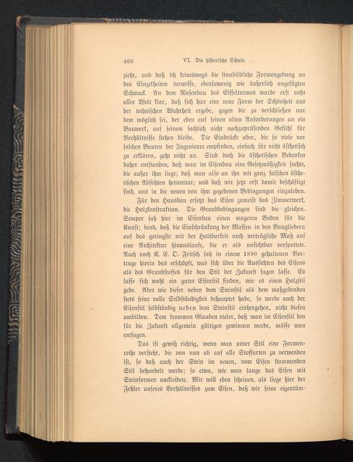 Für den Hausbau ersetzt das Eiseu zumeist das Zimmerwerk,die Holzkonstruktion. Die Grundbedingungen sind die gleichen.Semper sah hier im Eisenbau einen mageren Boden für dieKunst; fand, daß die Einschränkung der Massen in den Bangliedernauf das geringste mit der Haltbarkeit uoch verträgliche Maß aufeine Architektur hinauslaufe, die er als unsichtbar verspottete.Auch noch K. E. O. Fritsch sah in einem 1890 gehaltenen Bor-trage hierin das erschöpft, was sich über die Aussichten des Eisensals des Grundstoffes für den Stil der Zukunft sagen lasse. Eslasse sich wohl ein guter Eisenstil finden, wie es einen Holzstilgebe. Aber wie dieser neben dem Steinstil als dem maßgebendenstets seine volle Selbständigkeit behauptet habe, so werde auch derEiseustil selbständig neben dem Steinstil einhergehen, nicht diesenumbilden. Dem frommen Glauben vieler, daß man im Eisenstil denfür die Zukunft allgemein gültigen gewinnen werde, müsse manentsagen.