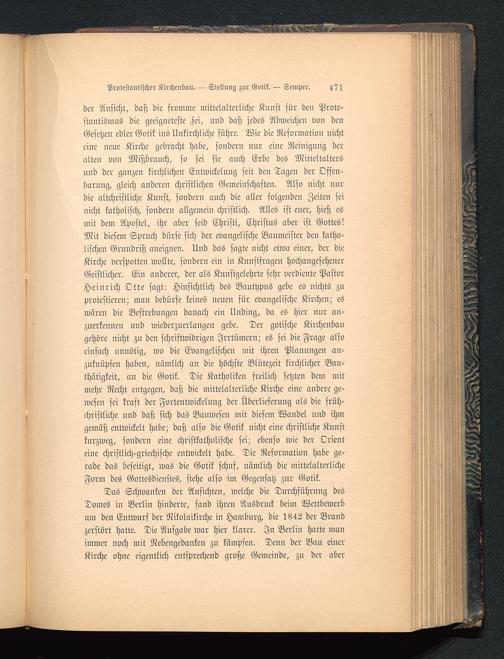 Das Schwanken der Ansichten, welche die Durchführung desDomes in Berlin hinderte, fand ihren Ausdruck beim Wettbewerbum den Entwurf der Nikolaikirche in Hamburg , die 1842 der Braudzerstört hatte. Die Aufgabe war hier klarer. In Berlin hatte manimmer noch mit Nebengedanken zu kämpfen. Denn der Bau eiuerKirche ohne eigentlich entsprechend große Gemeinde, zn der aber