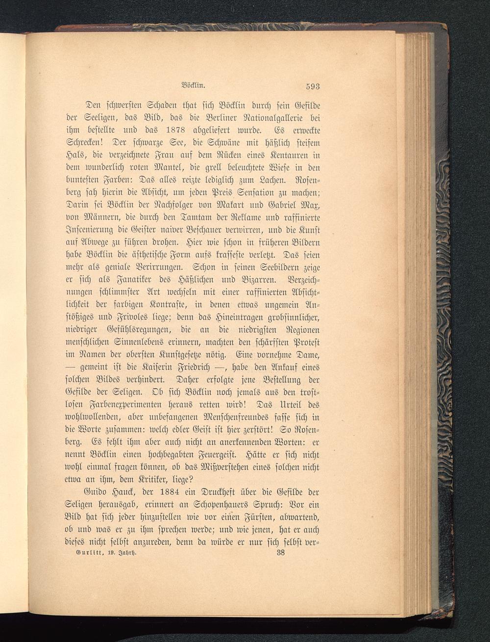 Guido Hauck , der 1884 ein Druckheft über die Gefilde derSeligen herausgab, erinnert an Schopenhauers Spruch: Vor einBild hat sich jeder hinzustellen wie vor einen Fürsten , abwartend,ob und was er zu ihm sprechen werde; und wie jenen, hat er auchdieses nicht selbst anzureden, denn da würde er nur sich selbst ver-