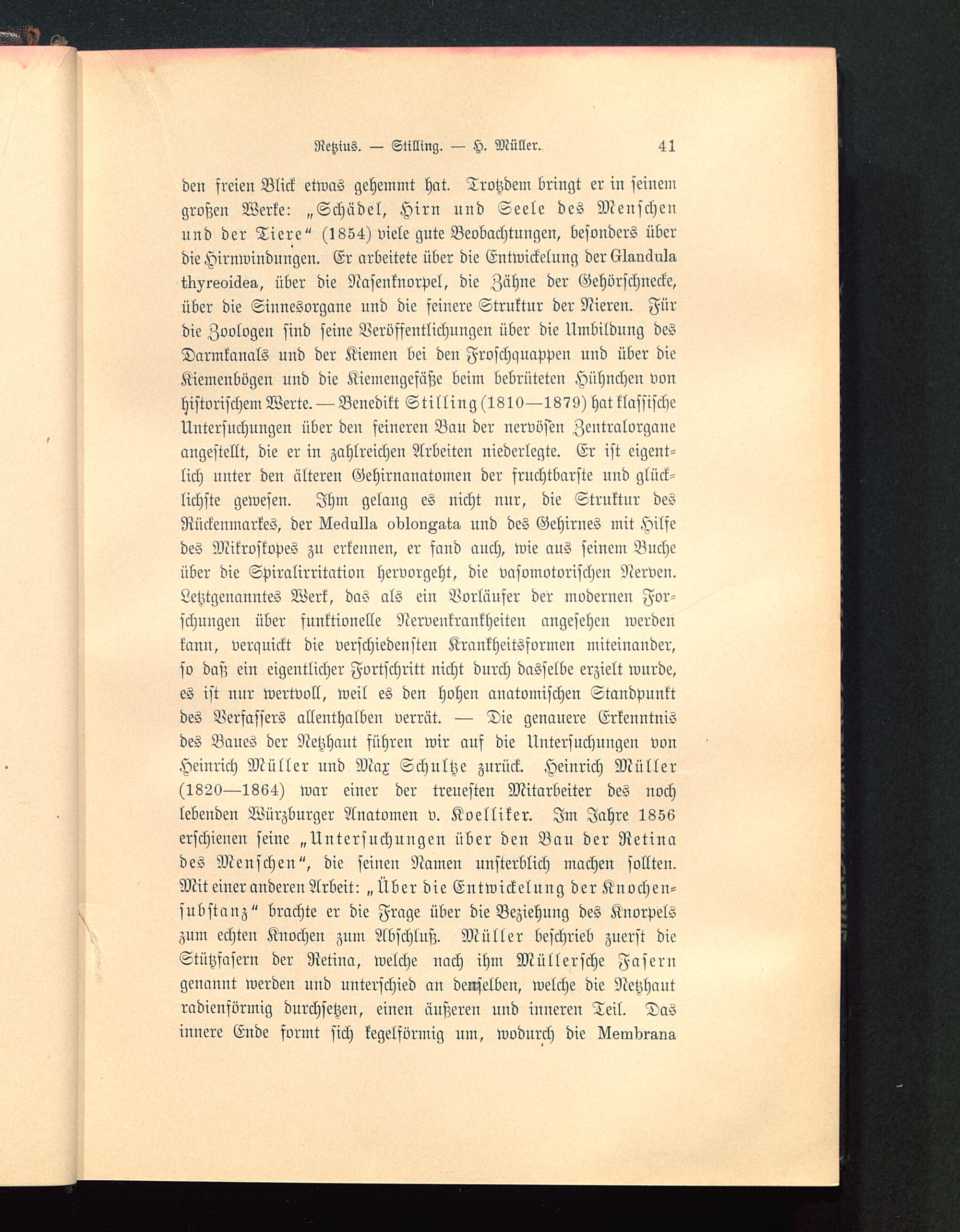 den freien Blick etwas gehemmt hat. Trotzdem bringt er in seinemgroßen Werke: „Schädel, Hirn und Seele des Menschenund der Tiere" (1854) viele gute Beobachtungen, besonders überdie Hirnwindungen. Er arbeitete über die Entwickelung der Aanäulg,tll^rsoiäsg., über die Nasenknorpel, die Zähne der Gehörschnecke,über die Sinnesorgane und die feinere Struktur der Nieren. Fürdie Zoologen sind seine Veröffentlichungen über die Umbildung desDarmkanals und der Kiemen bei den Froschquappen uud über dieKiemenbögen und die Kiemengefäße beim bebrüteten Hähnchen vonhistorischem Werte. — Benedikt Stilling (1810—1879) hat klassischeUntersuchungen über den feineren Ban der nervösen Zentralorganeangestellt, die er in zahlreichen Arbeiten niederlegte. Er ist eigent-lich unter den älteren Gehirnanatomen der fruchtbarste und glück-lichste gewesen. Ihm gelang es nicht nur, die Struktur desRückenmarkes, der Nsclullg. oklonAatg. und des Gehirnes mit Hilfedes Mikroskopes zu erkennen, er fand auch, wie aus seinem Bucheüber die Spiralirritation hervorgeht, die vasomotorischen Nerven.Letztgenanntes Werk, das als ein Vorläufer der modernen For-schungen über funktionelle Nervenkrankheiten angesehen werdenkann, verquickt die verschiedensten Krankheitsformen miteinander,so daß ein eigentlicher Fortschritt nicht durch dasselbe erzielt wurde,es ist nur wertvoll, weil es den hohen anatomischen Standpunktdes Verfassers allenthalben verrät. — Die genauere Erkenntnisdes Baues der Netzhaut führen wir auf die Untersuchungen vonHeinrich Müller und Max Schultze zurück. Heinrich Müller(1820—1864) war einer der treuesten Mitarbeiter des nochlebenden Würzburger Anatomen v. Koelliker. Im Jahre 1856erschienen seine „Untersuchungen über den Bau der Retinades Menschen", die seinen Namen unsterblich machen sollten.Mit einer anderen Arbeit: „Über die Entwickelung der Knochen-substanz" brachte er die Frage über die Beziehung des Knorpelszum echten Kuocheu zum Abschluß. Müller beschrieb zuerst dieStützsaseru der Retiua, welche uach ihm Müllersche Faserngenannt werden uud unterschied an denselben, welche die Netzhautradienförmig durchsetze», einen äußeren und inneren Teil. Dasinnere Ende formt fich kegelförmig um, wodurch die Uemdrana