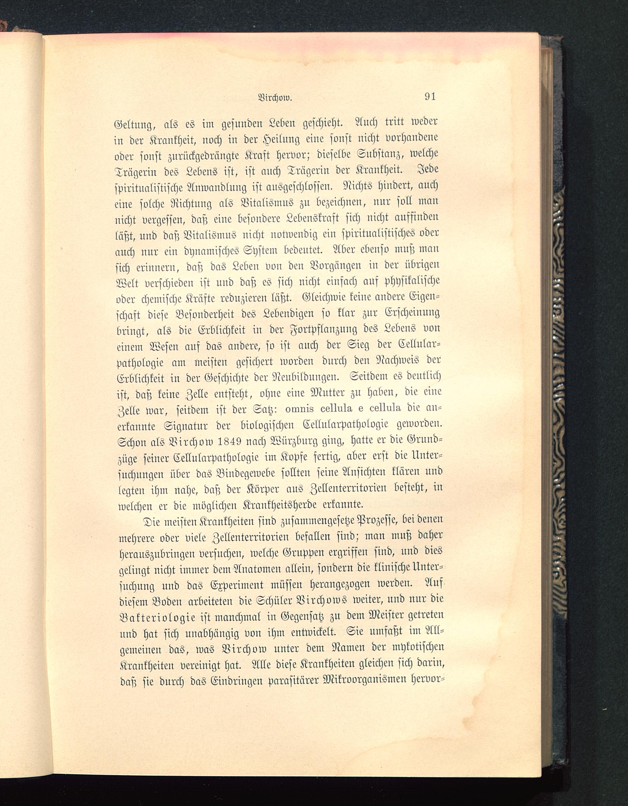 Geltung, als es im gesunden Leben geschieht. Auch tritt wederin der Krankheit, noch in der Heilnng eine sonst nicht vorhandeneoder sonst zurückgedräugte Kraft hervor; dieselbe Substanz, welcheTrägerin des Lebens ist, ist anch Trägerin der Krankheit. Jedespiritualistische Anwandlung ist ausgeschlossen. Nichts hindert, aucheine solche Richtuug als Vitalismus zu bezeichnen, nur soll mannicht vergessen, daß eine besondere Lebenskraft sich nicht ansfindenläßt, und daß VitaliSmuS nicht notwendig ein spiritualistisches oderauch nur ein dynamisches System bedeutet. Aber ebenso muß mansich eriuueru, das; das Lebeu vou deu Vorgängen in der übrigenWelt verschieden ist und daß es sich nicht einfach auf physikalischeoder chemische Kräfte reduzieren läßt. Gleichwie keine andere Eigen-schaft diese Besonderheit des Lebendigen so klar zur Erscheinungbringt, als die Erblichkeit in der Fortpflanzung des Lebens voneinem Wesen auf das andere, so ist auch der Sieg der Cellular-patholvgie am meisten gesichert worden durch den Nachweis derErblichkeit in der Geschichte der Neubildungen. Zeitdem es deutlichist, daß keine Zelle entsteht, ohne eine Mutter zu haben, die eineZelle war, seitdem ist der Satz: omnis eeUulg, s cellulü. die an-erkannte Signatur der biologischen Cellularpathologie geworden.Schon als Virchow 1849 nach Würzburg ging, hatte er die Grund-züge seiuer Cellularpathologie im Kopse fertig, aber erst die Unter-suchungen über das Bindegewebe sollten seine Ansichten klären undlegten ihm nahe, daß der Körper aus Zellenterritorien besteht, inmelchen er die möglichen Krankheitsherde erkannte.