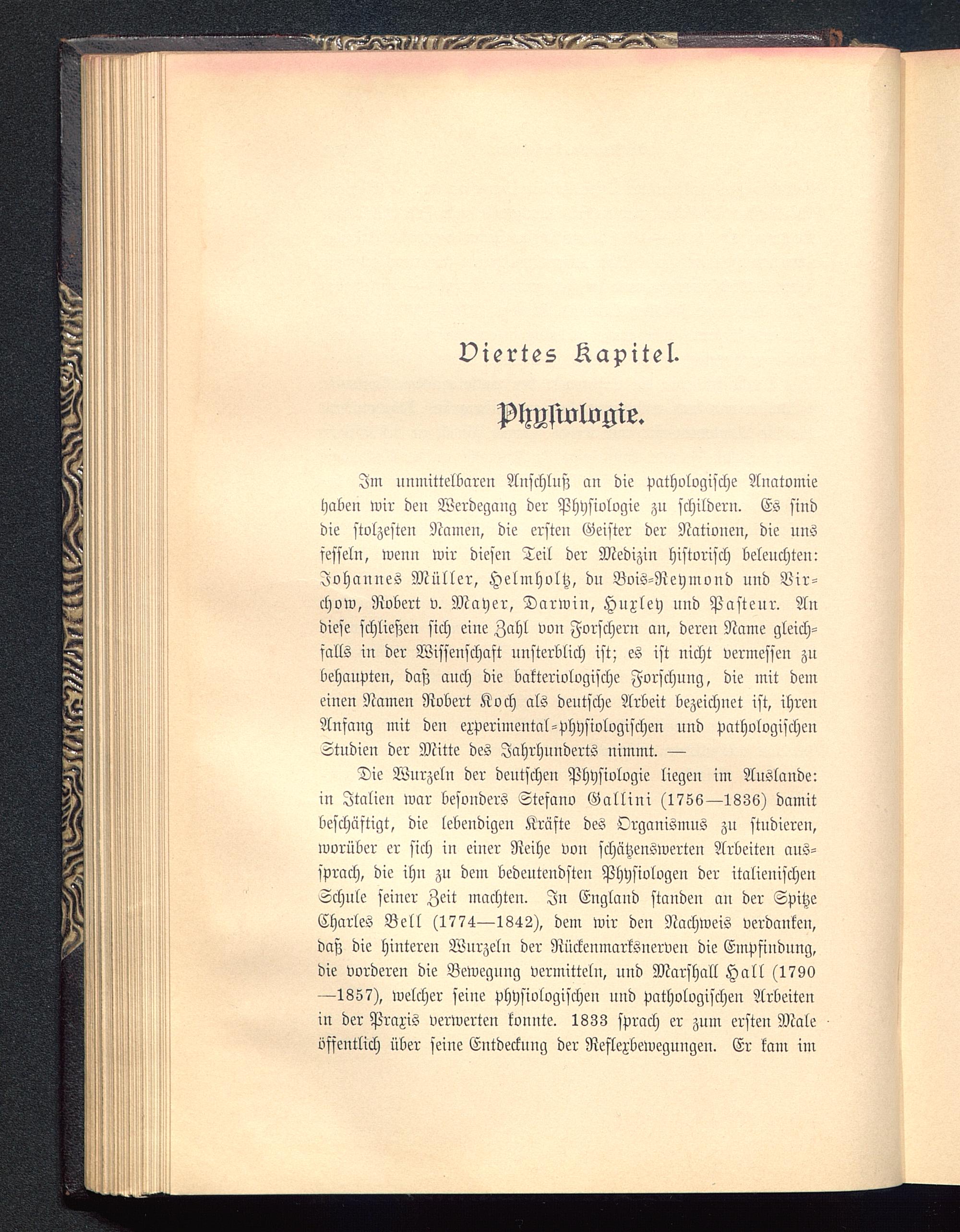 Die Wurzeln der deutschen Physiologie liegen im Auslande:in Italien war besonders Stefano Gallini (1766—1836) damitbeschäftigt, die lebendigen Kräfte des Organismus zu studieren,worüber er sich in einer Reihe von schätzenswerten Arbeiten aus-sprach, die ihn zu dem bedeutendsten Physiologen der italienischenSchule seiner Zeit machten. In England standen an der SpitzeCharles Bell (1774—1842), dem wir den Nachweis verdanken,daß die Hinteren Wurzeln der Nückenmarksnerven die Empsiudnng,die vorderen die Bewegung vermitteln, nnd Marshall Hall (1790—1857), welcher seine physiologischen nnd pathologischen Arbeitenin der Praxis verwerten konnte. 1833 sprach er zum ersten Maleöffentlich über seine Entdeckung der Reflexbewegungen. Er kam im
