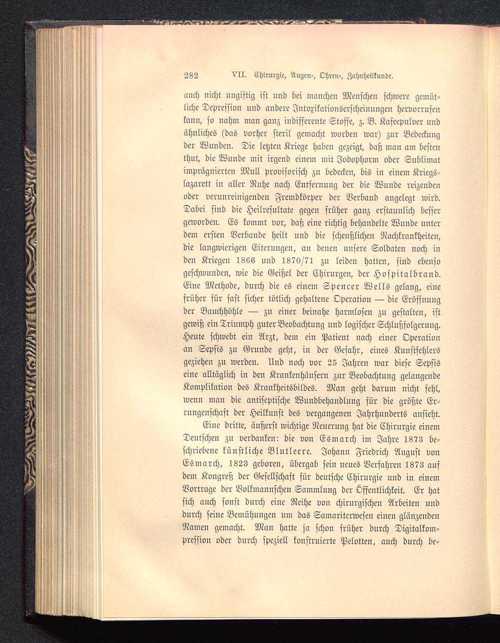 auch nicht ungiftig ist nnd bei manchen Menschen schwere gemüt-liche Depression und andere Jntoxikationserscheinungen hervorrufenkann, so nahm man ganz indifferente Stoffe, z. B. Kafeevulver undähnliches (das vorher steril gemacht worden war) zur Bedeckungder Wunden. Die letzten Kriege haben gezeigt, daß man am bestenthut, die Wunde mit irgend einem mit Jodophorm oder Sublimatimprägnierten Mull provisorisch zu bedecken, bis in einem Kriegs-lazarett in aller Rnhe nach Entfernung der die Wunde reizendenoder verunreinigenden Fremdkörper der Verband angelegt wird.Dabei sind die Heilresultate gegen früher ganz erstaunlich bessergeworden. Es kommt vor, daß eine richtig behandelte Wunde unterdem ersten Verbände heilt und die scheußlichen Nachkrankheiten,die langwierigen Eiterungen, an denen unsere Soldaten noch inden Kriegen 1866 und 1870/71 zu leiden hatten, sind ebensogeschwunden, wie die Geißel der Chirurgen, der Hospitalbrand.Eine Methode, durch die es einem Spencer Wells gelang, einefrüher für fast sicher tötlich gehaltene Operation — die Eröffnungder Bauchhöhle — zu einer beinahe harmlosen zu gestalten, istgewiß ein Triumph guter Beobachtung und logischer Schlußfolgerung.Heute schwebt ein Arzt, dem ein Patient nach einer Operationan Sepsis zu Grunde geht, in der Gefahr, eines Kunstfehlersgeziehen zu werden. Und noch vor 25 Jahren war diese Sepsiseine alltäglich in den Krankenhäusern zur Beobachtung gelangendeKomplikation des Krankheitsbildes. Man geht darum nicht fehl,wenn man die antiseptische Wundbehandlung für die größte Er-rungenschaft der Heilkunst des vergangenen Jahrhunderts ansieht.