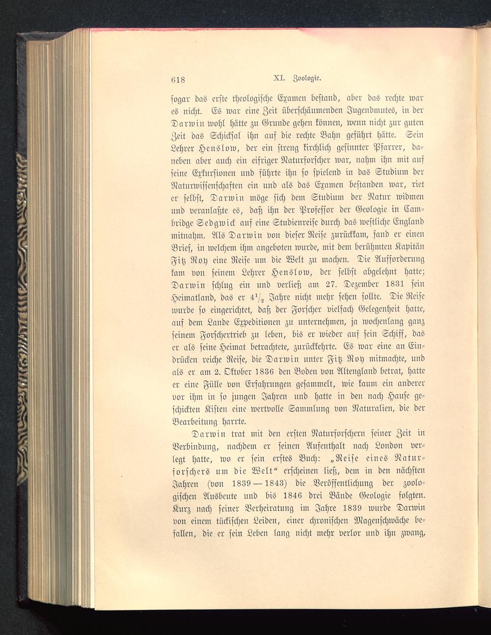 sogar das erste theologische Examen bestand, aber das rechte wares nicht. Es war eine Zeit überschäumenden Jugendmutes, in derDarwin Wohl hätte zu Grnnde gehen können, wenn nicht zur gutenZeit das Schicksal ihn auf die rechte Bahu geführt hätte. SeinLehrer Heuslow, der ein streng kirchlich gesinnter Pfarrer, da-neben aber auch ein eifriger Naturforscher war, uahm ihn mit auffeine Exkursionen und führte ihn so spielend in das Studium derNaturwissenschaften ein und als das Examen bestanden war, rieter selbst, Darwin möge sich dem Studium der Natur widmenund veranlaßte es, daß ihn der Professor der Geologie in Cam-bridge Sedgwick auf eine Studienreise durch das westliche England mitnahm. Als Darwin von dieser Reise zurückkam, faud er einenBrief, in welchem ihm angeboten wurde, mit dem berühmten KapitänFitz Roy eine Reise nm die Welt zu macheu. Die Aufforderungkam von seinem Lehrer Henslow , der selbst abgelehnt hatte;Darwin schlug ein nnd verließ am 27. Dezember 1831 feinHeimatland, das er 4^/„ Jahre nicht mehr sehen sollte. Die Reisewurde so eingerichtet, daß der Forscher vielfach Gelegenheit hatte,auf dem Lande Expeditionen zu unternehmen, ja wochenlang ganzseinem Forschertrieb zu leben, bis er wieder auf feiu Schiff, daser als seine Heimat betrachtete, zurückkehrte. Es war eiue au Ein-drückeu reiche Reise, die Darwin unter Fitz Roy mitmachte, undals er am 2. Oktober 1836 deu Boden von Altengland betrat, hatteer eine Fülle von Erfahrungen gesammelt, wie kaum eiu anderervor ihm in so jungen Jahren nnd hatte in den nach Hanse ge-schickten Kisten eiue wertvolle Sammlung von Naturalien, die derBearbeitung harrte.