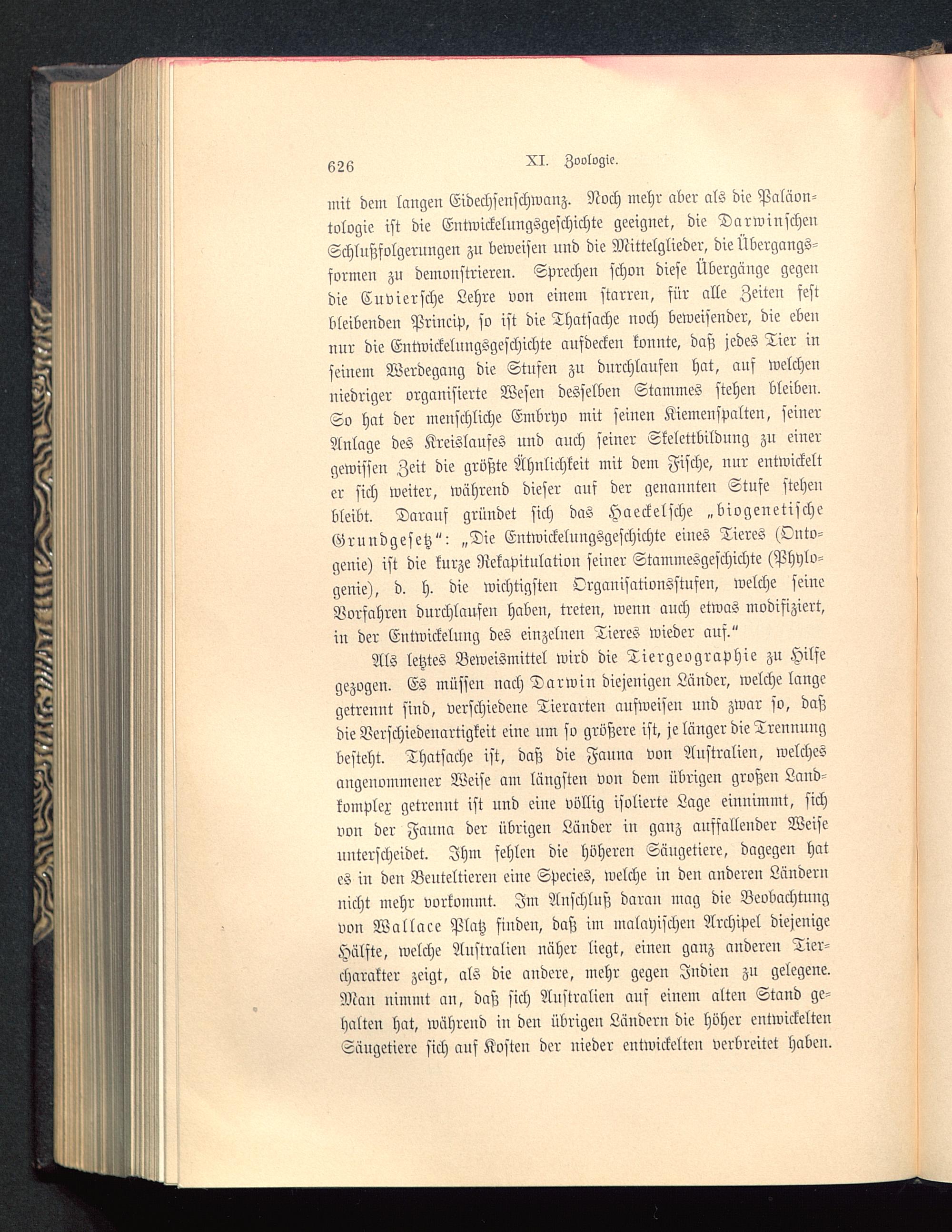 Als letztes Beweismittel wird die Tiergeographie zu Hilfegezogen. Es müssen nach Darwin diejenigen Länder, welche langegetrennt sind, verschiedene Tierarten aufweisen und zwar so, daßdie Berschiedenartigkeit eine um so größere ist, je länger die Trennungbesteht. Thatsache ist, daß die Fauna von Australien , welchesangenommener Weise am längsten von dem übrigen großen Land-komplex getrennt ist und eine völlig isolierte Lage einnimmt, sichvon der Fauna der übrigen Länder in ganz auffallender Weiseunterscheidet. Ihm fehlen die höheren Säugetiere, dagegen hates in den Beuteltieren eine Species, welche in den anderen Ländernnicht mehr vorkommt. Im Anschluß daran mag die Beobachtungvon Wallace Platz finden, daß im malayischen Archipel diejenigeHälfte, welche Australien näher liegt, einen ganz anderen Tier-charakter zeigt, als die andere, mehr gegen Indien zu gelegene.Man nimmt an, daß sich Australien auf einem alten Stand ge-halten hat, während in den übrigen Ländern die höher entwickeltenSäugetiere sich auf Kosten der nieder entwickelten verbreitet haben.