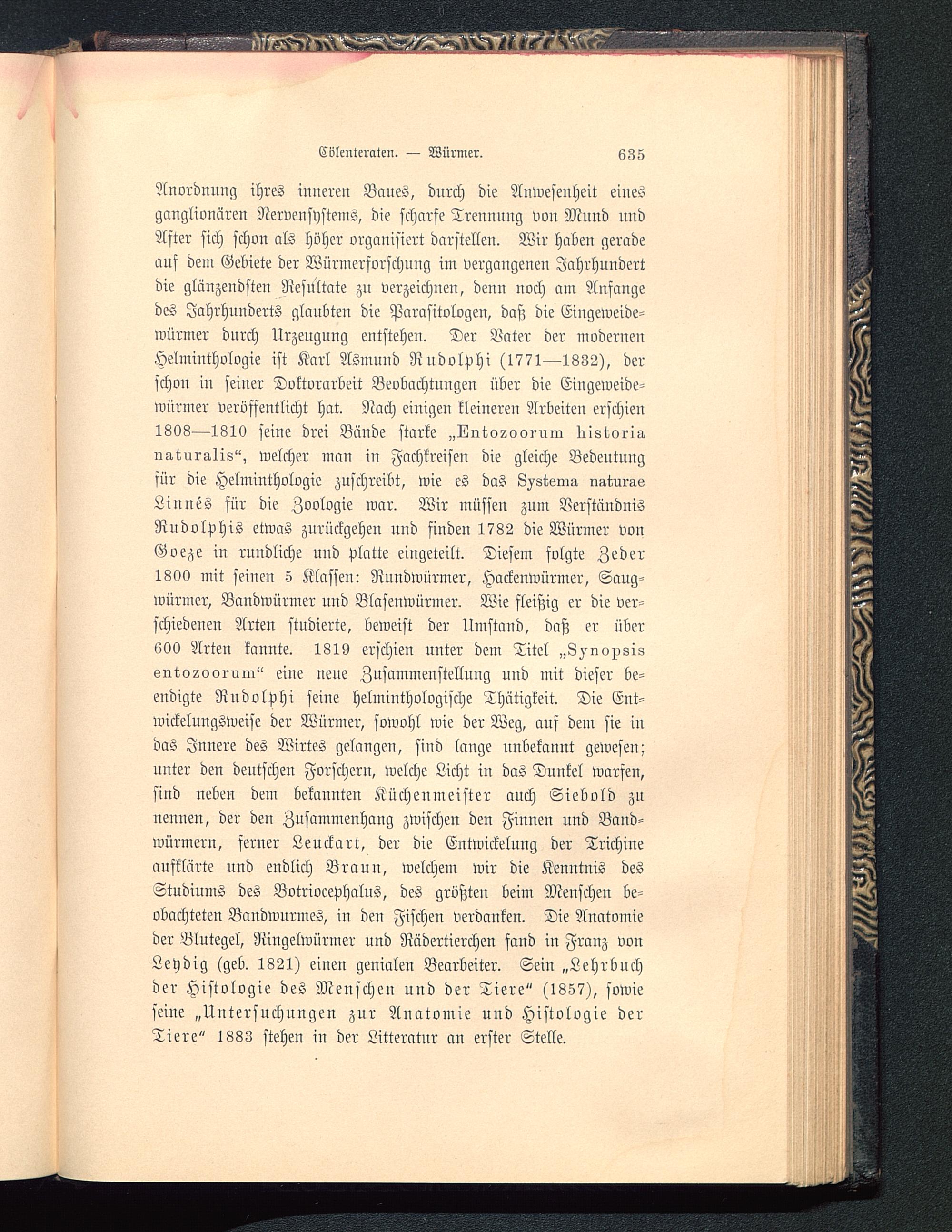Anordnung ihres inneren Baues, durch die Anwesenheit einesganglionären Nervensystems, die scharfe Treunuug von Mund undAfter sich schon als höher organisiert darstellen. Wir haben geradeauf dem Gebiete der Würmerforschung im vergangenen Jahrhundertdie glänzendsten Resultate zu verzeichnen, denn noch am Anfangedes Jahrhunderts glaubten die Parasitologen, daß die Eingeweide-würmer dnrch Urzeugung entstehen. Der Vater der modernenHelminthologie ist Karl Asmund Rudolphi (1771—1832), derschon in seiner Doktorarbeit Beobachtungen über die Eingeweide-würmer veröffentlicht hat. Nach einigen kleinerei? Arbeiten erschien1808—1810 seine drei Bände starke „Lntv^oorum llistorig.naturalis", welcher man in Fachkreisen die gleiche Bedeutungfür die Helminthologie zuschreibt, wie es das L^steina uaturavLinnes für die Zoologie war. Wir müssen zum VerständnisRudolphis etwas zurückgehen und finden 1782 die Würmer vonGoeze in rundliche und platte eingeteilt. Diesem folgte Zeder1800 mit seinen 5 Klassen: Rundwürmer, Hackenwürmer, Saug-würmer, Bandwürmer und Blasenwürmer. Wie fleißig er die ver-schiedenen Arten studierte, beweist der Umstand, daß er über600 Arten kannte. 1819 erschien unter dem Titel „L^uciiZZjssritcZ200ruor" eine neue Zusammenstellung und mit dieser be-endigte Rudolphi seine helminthologische Thätigkeit. Die Ent-wickelungsweise der Würmer, sowohl wie der Weg, auf dem sie indas Innere des Wirtes gelangen, sind lange unbekannt gewesen;unter den deutschen Forschern, welche Licht in das Dunkel warfen,sind neben dem bekannten Küchenmeister auch Siebold zunennen, der den Zusammenhang zwischen den Finnen und Band-würmern, ferner Leuckart, der die Entwickelung der Trichineaufklärte und endlich Brauu, welchem wir die Kenntnis desStudiums des Botrivcephalus, des größten beim Menschen be-obachteten Bandwnrmes, in den Fischen verdanken. Die Anatomieder Blutegel, Ningelwürmer und Rädertiercheu fand in Franz vonLeydig (geb. 1821) einen genialen Bearbeiter. Sein „Lehrbuchder Histologie des Meuscheu uud der Tiere" (1857), sowiefeine „Untersuchungen zur Anatomie und Histologie derTiere" 1883 stehen in der Litteratur an erster Stelle.
