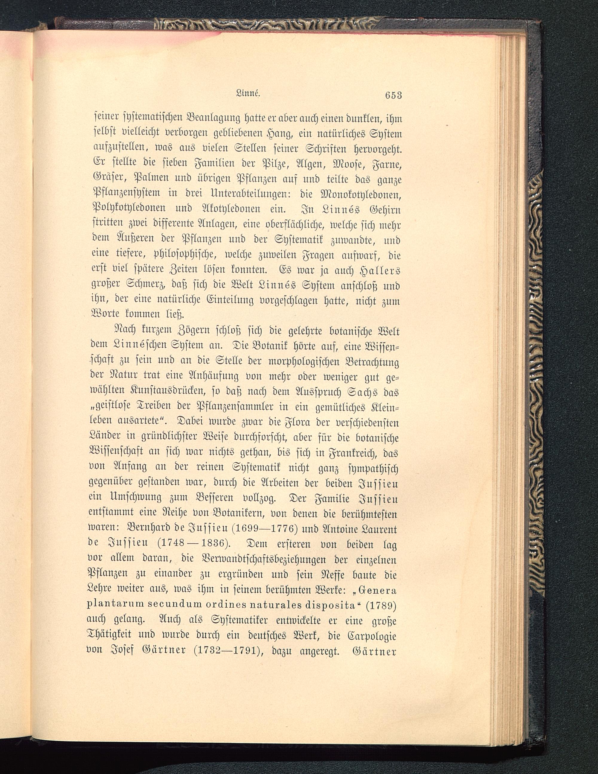 seiner systematischen Beanlagung hatte er aber anch einen dunklen, ihmselbst vielleicht verborgen gebliebenen Hang, ein natürliches Systemaufzustellen, was aus vielen Stellen seiner Schriften hervorgeht.Er stellte die sieben Familien der Pilze, Algen, Moose, Farne,Gräser, Palmen und übrigen Pflanzen auf und teilte das ganzePflanzensystem in drei Unterabteilungen: die Monokotyledonen,Polykotyledonen und Akotyledonen ein. In Linnss Gehirnstritten zwei differente Anlagen, eine oberflächliche, welche sich mehrdem Äußeren der Pflanzen und der Systematik zuwandte, undeine tiefere, philosophische, welche zuweilen Fragen aufwarf, dieerst viel spätere Zeiten losen konnten. Es war ja auch Hallersgroßer Schmerz, daß sich die Welt Linnss System anschloß undihn, der eine natürliche Einteilung vorgeschlagen hatte, nicht zumWorte kommen ließ.