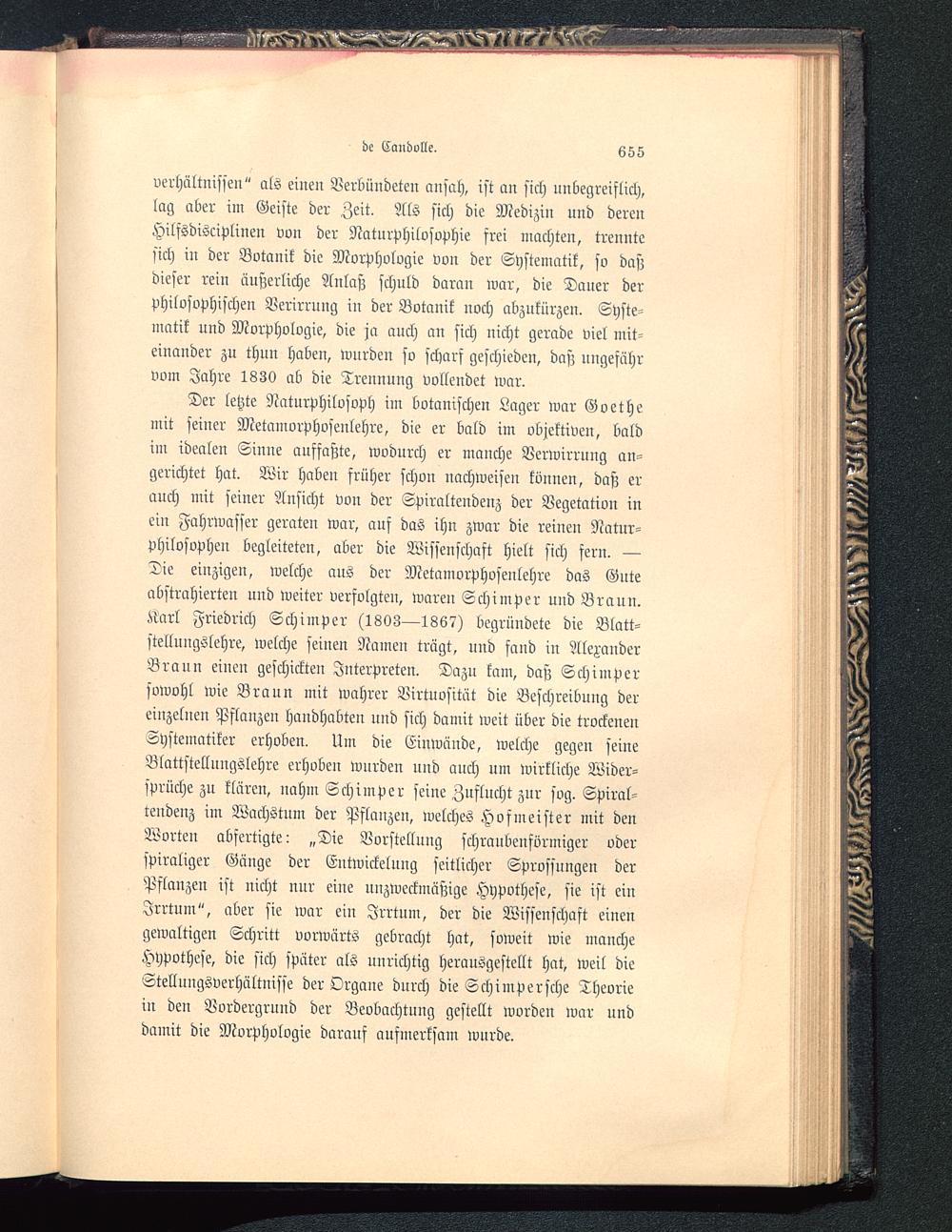Verhältnissen" als einen Verbündeten ansah, ist an sich unbegreiflich,lag aber im Geiste der Zeit. Als sich die Medizin und derenHilfsdisciplinen von der Naturphilosophie frei machten, trenntesich in der Botanik die Morphologie von der Systematik, so daßdieser rein äußerliche Anlaß schuld daran war, die Dauer derphilosophischen Verirrung in der Botanik noch abzukürzen. Syste-matik und Morphologie, die ja auch an sich nicht gerade viel mit-einander zu thun haben, wurden so scharf geschieden, daß uugesährvom Jahre 1830 ab die Treunung vollendet war.