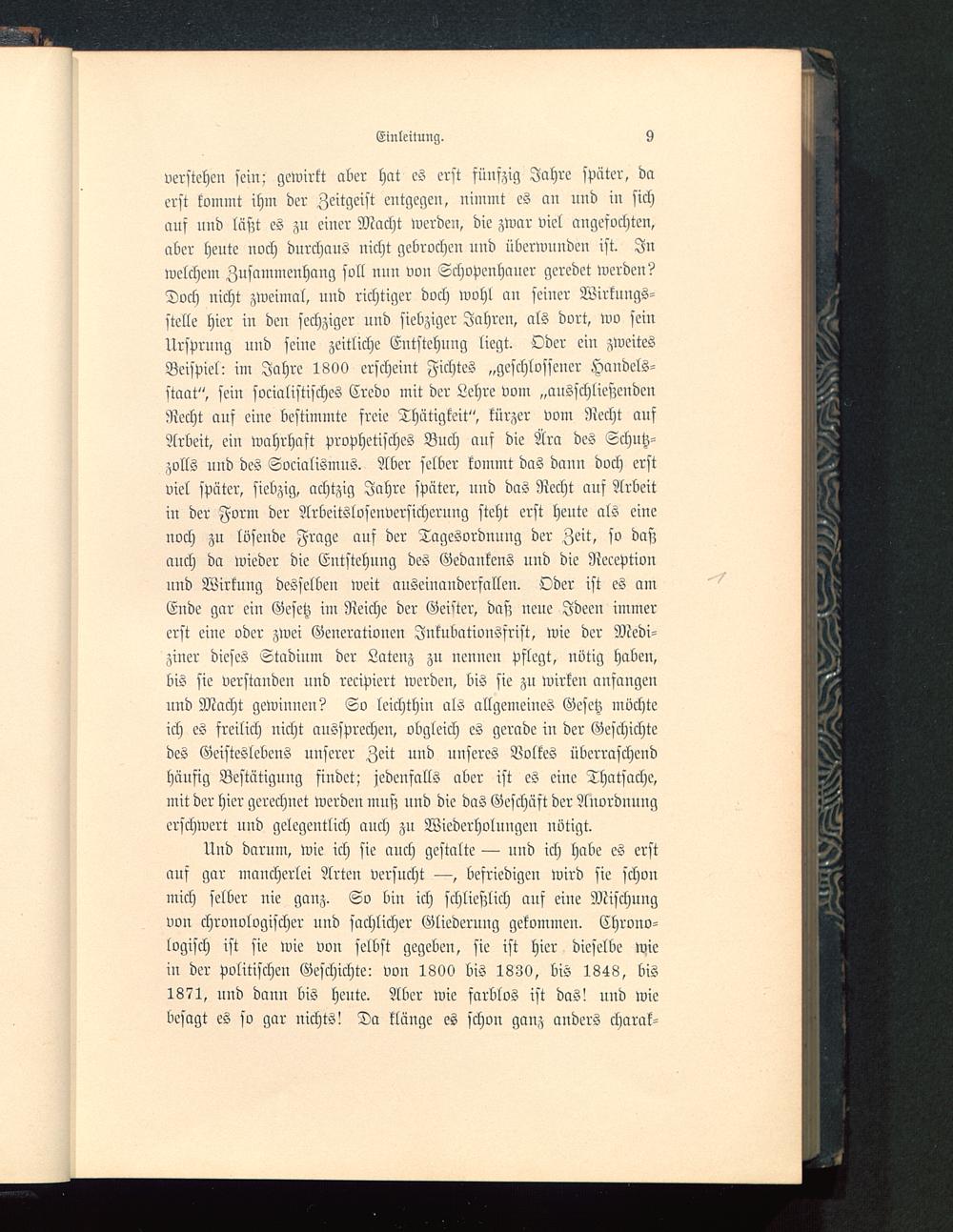 verstehen sein; gewirkt aber hat es erst fünfzig Jahre später, daerst kommt ihm der Zeitgeist entgegen, nimmt es an und in sichauf und läßt es zn einer Macht werden, die zwar viel angesvchtcn,aber heute noch durchaus nicht gebrochen nnd überwunden ist. Inwelchem Zusammenhang soll nnn von Schopenhauer geredet werden?Doch nicht zweimal, und richtiger doch wohl au seiner Wirkungs-stelle hier in den sechziger und siebziger Jahren, als dort, wo seinUrsprung nnd seine zeitliche Entstehung liegt. Oder eiu zweitesBeispiel: im Jahre 1800 erscheint Fichtes „geschlossener Handels-staat", sein socialistisches Credo mit der Lehre vom „ausschließendenRecht auf eine bestimmte freie Thätigkeit", kürzer vom Recht aufArbeit, ein wahrhaft prophetisches Buch ans die Ära des Schutz-zolls und des Socialismus. Aber selber kommt das dann doch erstviel später, siebzig, achtzig Jahre später, und das Recht aus Arbeitin der Form der Arbeitslosenversicherung steht erst heute als einenoch zu lösende Frage aus der Tagesordnung der Zeit, so daßauch da wieder die Entstehung des Gedankens und die Receptionund Wirkung desselben weit auseinanderfallen. Oder ist es amEnde gar ein Gesetz im Reiche der Geister, daß neue Jdeeu immererst eine oder zwei Generationen JnkubationSfrist, wie der Medi-ziner dieses Stadium der Latenz zu nennen pflegt, nötig habeu,bis sie verstanden nnd recipiert werden, bis sie zu wirken anfange,?und Macht gewinnen? So leichthin als allgemeines Gesetz möchteich es freilich nicht aussprechen, obgleich es gerade in der Geschichtedes Geisteslebens unserer Zeit und unseres Volkes überraschendhäufig Bestätigung findet; jedenfalls aber ist es eine Thatsache,mit der hier gerechnet werdeu muß und die das Geschäst der Anordnungerschwert und gelegentlich auch zu Wiederholungen nötigt.