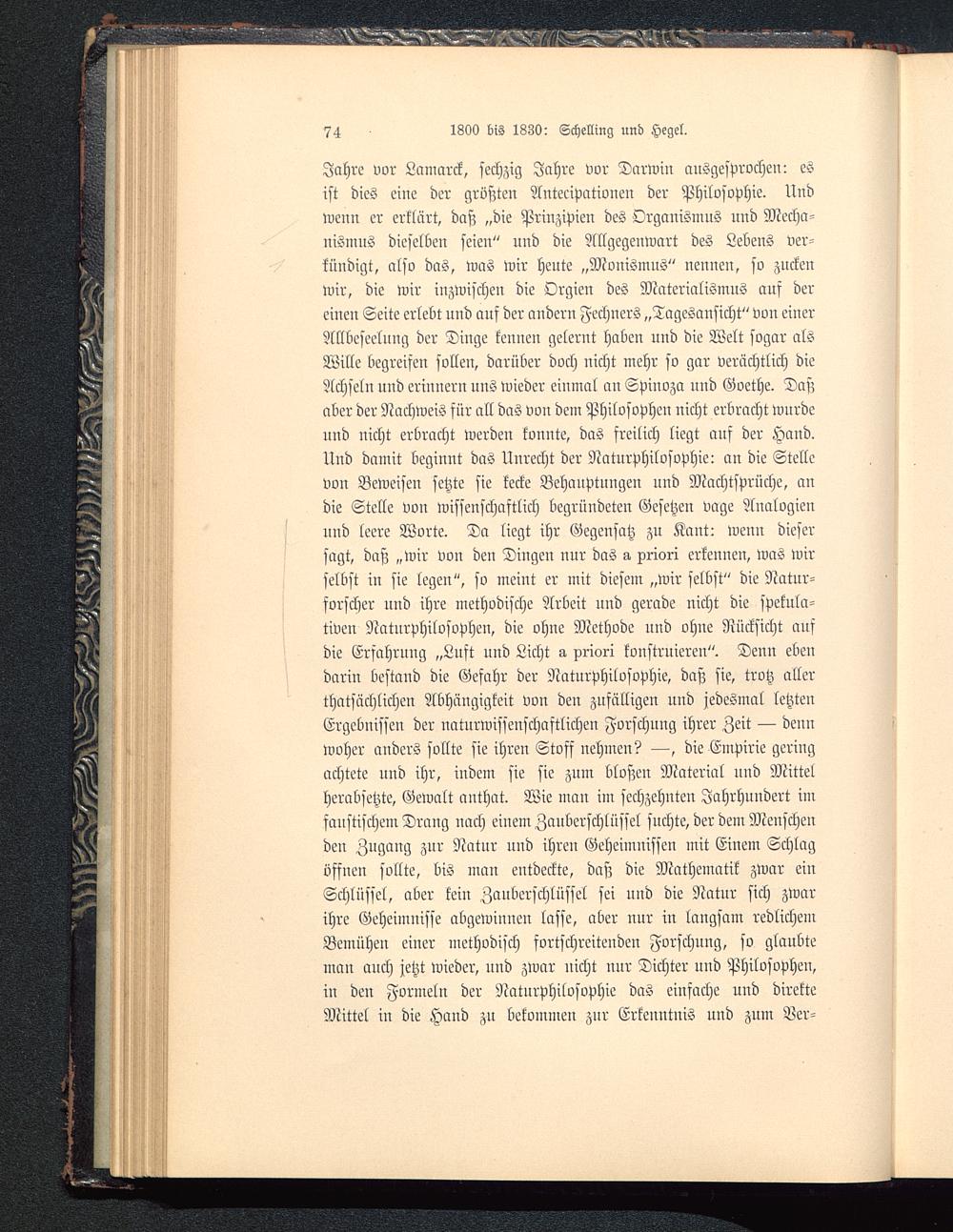 Jahre vor Lamarck, sechzig Jahre vor Darwin ausgesprochen: esist dies eine der größten Antecipationen der Philosophie. Undwenn er erklärt, daß „die Prinzipien des Organismus nnd Mecha-nismus dieselben seien" und die Nllgegenwart des Lebens ver-kündigt, also das, was wir heute „Monismus " nennen, so zuckenwir, die wir inzwischen die Orgien des Materialismus auf dereiuen Seite erlebt und auf der audern Fcchncrs „Tagesansicht" von einerAllbeseelung der Dinge kennen gelernt haben und die Welt sogar alsWille begreifen sollen, darüber doch nicht mehr so gar verächtlich dieAchseln und erinnern uns wieder einmal an Spinoza nnd Goethe. Daßaber der Nachweis für all das von dem Philosophen nicht erbracht wurdennd nicht erbracht werden konnte, das freilich liegt auf der Hand,lind damit beginnt das Unrecht der Naturphilosophie: au die Stellevon Beweisen setzte sie kecke Behauptungen und Machtsprüchc, andie Stelle von wissenschaftlich begründeten Gesetzen vage Analogiennnd leere Worte. Da liegt ihr Gegensatz zu Kant : wenn diesersagt, daß „wir von den Dingen nur das a. priori erkennen, was wirselbst in sie legen", so meint er mit diesem „wir selbst" die Natur-forscher und ihre methodische Arbeit uud gerade nicht die spekula-tiven Naturphilosophien, die ohne Methode und ohne Rücksicht aufdie Erfahrung „Luft uud Licht a priori konstruieren". Denn ebendarin bestand die Gefahr der Naturphilosophie, daß sie, trotz allerthatsächlichen Abhängigkeit von den zufälligen nnd jedesmal letztenErgebnissen der naturwissenschaftlichen Forschung ihrer Zeit — dennwoher anders sollte sie ihren Stoff nehmen? —, die Empirie geringachtete und ihr, indem sie sie zum bloßen Material und Mittelherabsetzte, Gewalt anthat. Wie man im sechzehnten Jahrhundert imfaustischem Drang nach einem Zanberschlüssel suchte, der dem Meuschenden Zugang zur Natur uud ihreu Geheimnissen mit Einem Schlagöffnen sollte, bis man entdeckte, daß die Mathematik zwar einSchlüssel, aber kein Zanberschlüssel sei und die Natur sich zwarihre Geheimnisse abgewinnen lasse, aber nur in langsam redlichemBemühen einer methodisch fortschreitenden Forschung, so glaubteman auch jetzt wieder, und zwar nicht nur Dichter nnd Philosophen,in den Formeln der Naturphilosophie das einfache und direkteMittel in die Hand zu bekommen zur Erkenntnis und zum Ver-