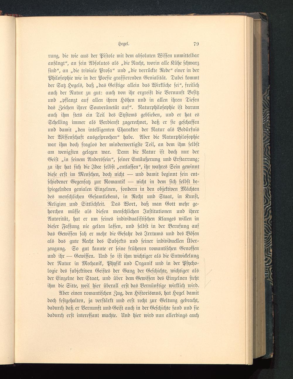 Aber einen romantischen Zug, den Historismus, hat Hegel damitdoch festgehalten, ja verstärkt und erst recht zur Geltung gebracht,dadurch daß er Vernunft und Geist anch in der Geschichte fand und siedadurch erst interessant machte. Und hier wird nun allerdings auch