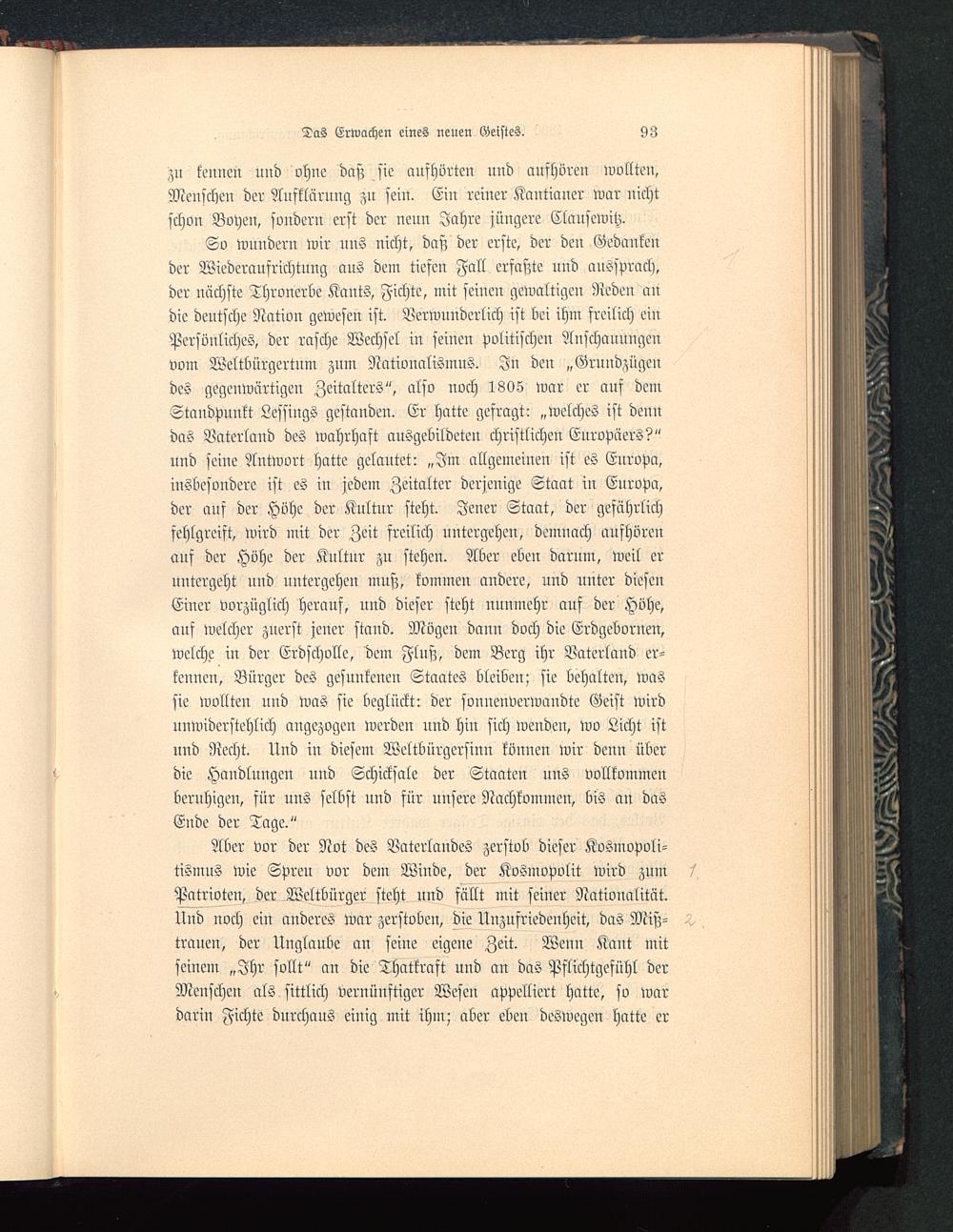 So wundern wir uns nicht, daß der erste, der den Gedankender Wiederaufrichtung aus dem tiefen Fall erfaßte nnd aussprach,der nächste Thronerbe Kants , Fichte, mit seinen gewaltigen Reden andie deutsche Nation gewesen ist. Verwunderlich ist bei ihm freilich einPersönliches, der rasche Wechsel in seinen politischen Anschauungenvom Weltbürgertum zum Nationalismus. In den „Grnndzügendes gegenwärtigen Zeitalters", also noch 1805 war er auf demStandpunkt Lessings gestanden. Er hatte gefragt: „welches ist denndas Vaterland des wahrhaft ausgebildeten christlichen Europäers?"und seine Antwort hatte gelautet: „Im allgemeinen ist es Europa ,insbesondere ist es in jedem Zeitalter derjenige Staat in Enropa,der auf der Höhe der Kultur steht. Jener Staat, der gefährlichfehlgreift, wird mit der Zeit freilich untergehen, demnach aufhörenauf der Höhe der Kultur zu stehen. Aber eben darum, weil eruntergeht nnd untergehen muß, kommen andere, und unter diesenEiner vorzüglich herauf, und dieser steht nunmehr auf der Höhe,auf welcher zuerst jener stand. Mögen dann doch die Erdgebornen,welche in der Erdscholle, dem Fluß, dem Berg ihr Vaterland er-kennen, Bürger des gesunkenen Staates bleiben; sie behalten, wassie wollten und was sie beglückt: der sonnenverwandte Geist wirdunwiderstehlich augezogen werden und hin sich wenden, wo Licht istund Recht. Und in diesem Weltbürgersinn können wir denn überdie Handlungen und Schicksale der Staaten uns vollkommenberuhigen, für uns selbst und für unsere Nachkommen, bis an dasEnde der Tage."