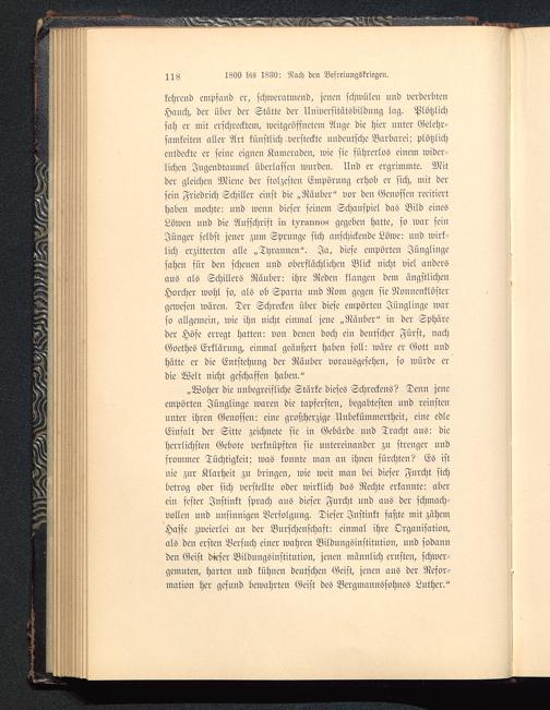 „Woher die unbegreifliche Stärke dieses Schreckens? Denn jeneempörten Jünglinge waren die tapfersten, begabtesten und reinstenunter ihren Genossen: eine großherzige Unbekümmertheit, eine edleEinfalt der Sitte zeichnete sie in Gebärde und Tracht aus: dieherrlichsten Gebote verknüpften fie untereinander zu streuger uudfrommer Tüchtigkeit; was kouute man an ihnen fürchten? Es istnie znr Klarheit zu bringen, wie weit mau bei dieser Furcht sichbetrog oder sich verstellte oder wirtlich das Rechte erkannte: aberein fester Instinkt sprach aus dieser Furcht und aus der schmach-vollen und unsinnigen Verfolgung. Dieser Instinkt faßte mit zähemHasse zweierlei an der Burscheuschaft: einmal ihre Organisation,als den ersteu Versuch eiuer wahren BildnngSinstitntion, nnd sodannden Geist dieser BildnngSinstitntion, jenen männlich erusteu, schwer-gemuten, harten nnd kühnen deutschen Geist, jenen ans der Refor-mation her gesuud bewahrten Geist des Bergmannssohnes Luther."