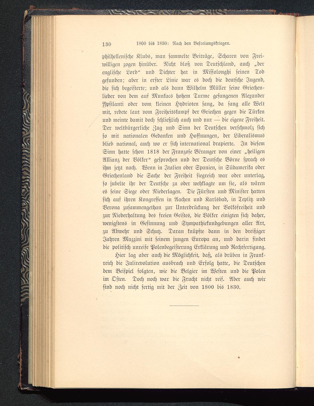 philhellenische Klubs, man sammelte Beiträge, Scharen von Frei-willigen zagen hinüber. Nicht bloß von Deutschland , auch „derenglische Lord" und Dichter hat iu Missolonghi seinen Todgefunden; aber in erster Linie war es doch die deutsche Jugeud,die sich begeisterte; und als dann Wilhelm Müller seine Griechen-lieder von dem aus Mnnkaes hohem Turme gefangenen AlexanderDpsilanti oder vom kleiueu Hydrioten saug, da sang alle Weltmit, redete laut vom Freiheitskampf der Griechen gegen die Türkenund meinte damit doch schließlich auch und nur — die eigene Freiheit.Der weltbürgerliche Zug und Sinn der Deutschen verschmolz sichso mit nationalen Gedanken uud Hoffnungen, der Liberalismusblieb national, auch wo er sich international drapierte. In diesemSinn hatte schon 1818 der Franzose Berauger vou einer „heiligenAllianz der Völker" gesprochen uud der Deutsche Börue sprach esihm jetzt nach. Wenn in Italien oder Spanien, in Südamerika oderGriechenland die Sache der Freiheit siegreich war oder unterlag,so jubelte ihr der Deutsche zu oder wehklagte um sie, als wärenes seine Siege oder Niederlagen. Die Fürsten und Minister hatteusich aus ihren Kongressen in Aachen und Karlsbad, in Tevlitz undVerona zusammengethan zur Unterdrückung der Volkssreiheit undzur Niederhaltung des freien Geistes, die Völker einigten sich daher,wenigstens in Gesinnung und Sympathiekundgebungen aller Art,zu Abwehr und Schutz. Daran knüpfte dann in den dreißigerJahren Mazzini mit seinem jungen Europa au, uud darin findetdie politisch unreife Polenbegeisterung Erkläruug und Rechtfertigung.