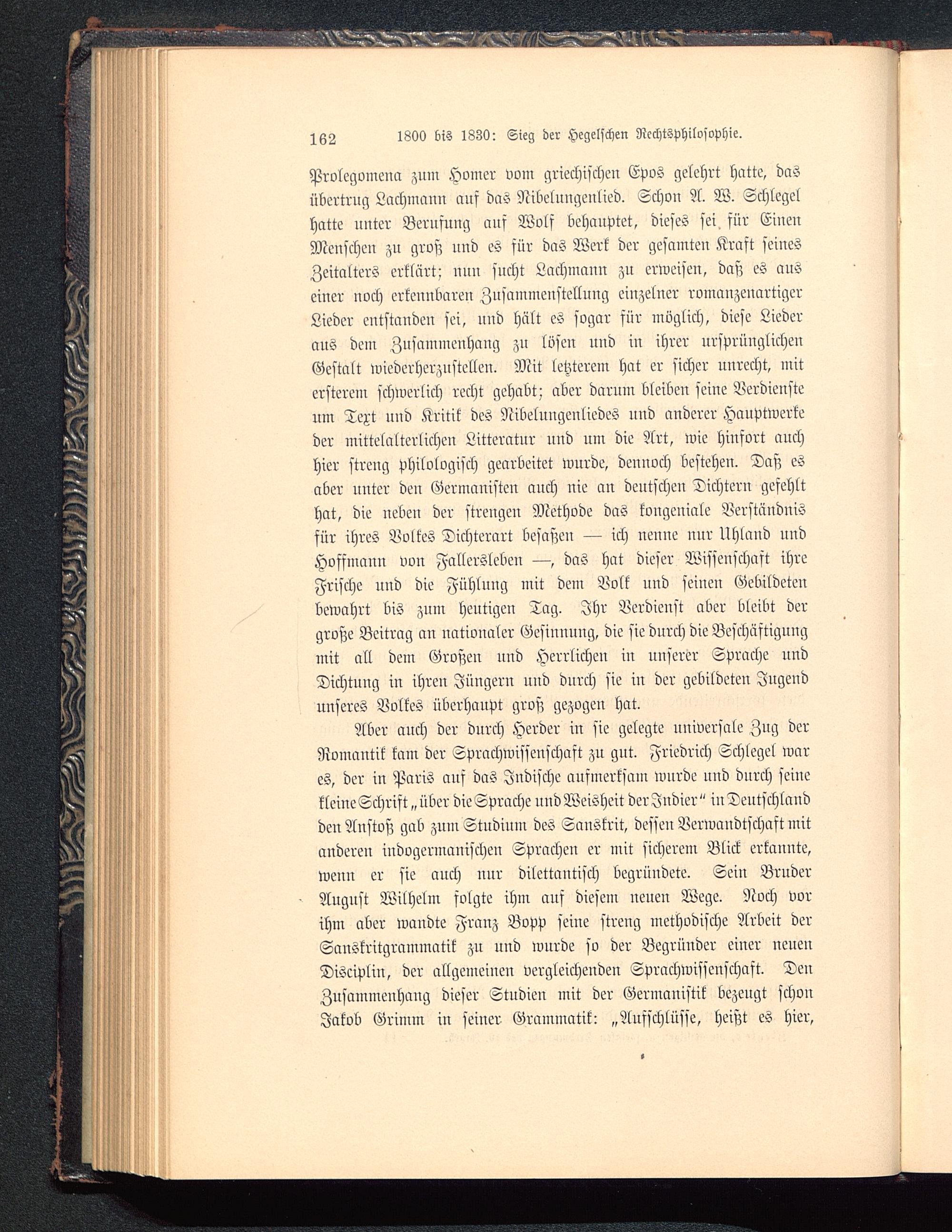 Aber auch der durch Herder in sie gelegte universale Zng derRomantik kam der Sprachwissenschaft zu gut. Friedrich Schlegel wares, der in Paris ans das Indische aufmerksam wnrde uud durch seinekleineSchrift „über dicSprache uud Weisheit derJudier" inDeutschlandden Austoß gab zum Studium des SnnSkrit, dessen Verwandtschaft mitanderen indogermanischen Sprachen er mit sicherem Blick erkannte,wenn er sie auch mir dilettantisch begründete. Sein BruderAugust Wilhelm solgte ihm auf diesem neueu Wege. Noch vorihm aber wandte Franz Bopp seine streng methodische Arbeit derSanskritgrammatik zn und wnrde so der Begründer einer neueuDisciplin, der allgemeinen vergleichenden Sprachwissenschaft. DenZusammenhang dieser Studien mit der Germanistik bezeugt schouJakob Grimm in seiner Grammatik: „Aufschlüsse, heißt es hier,