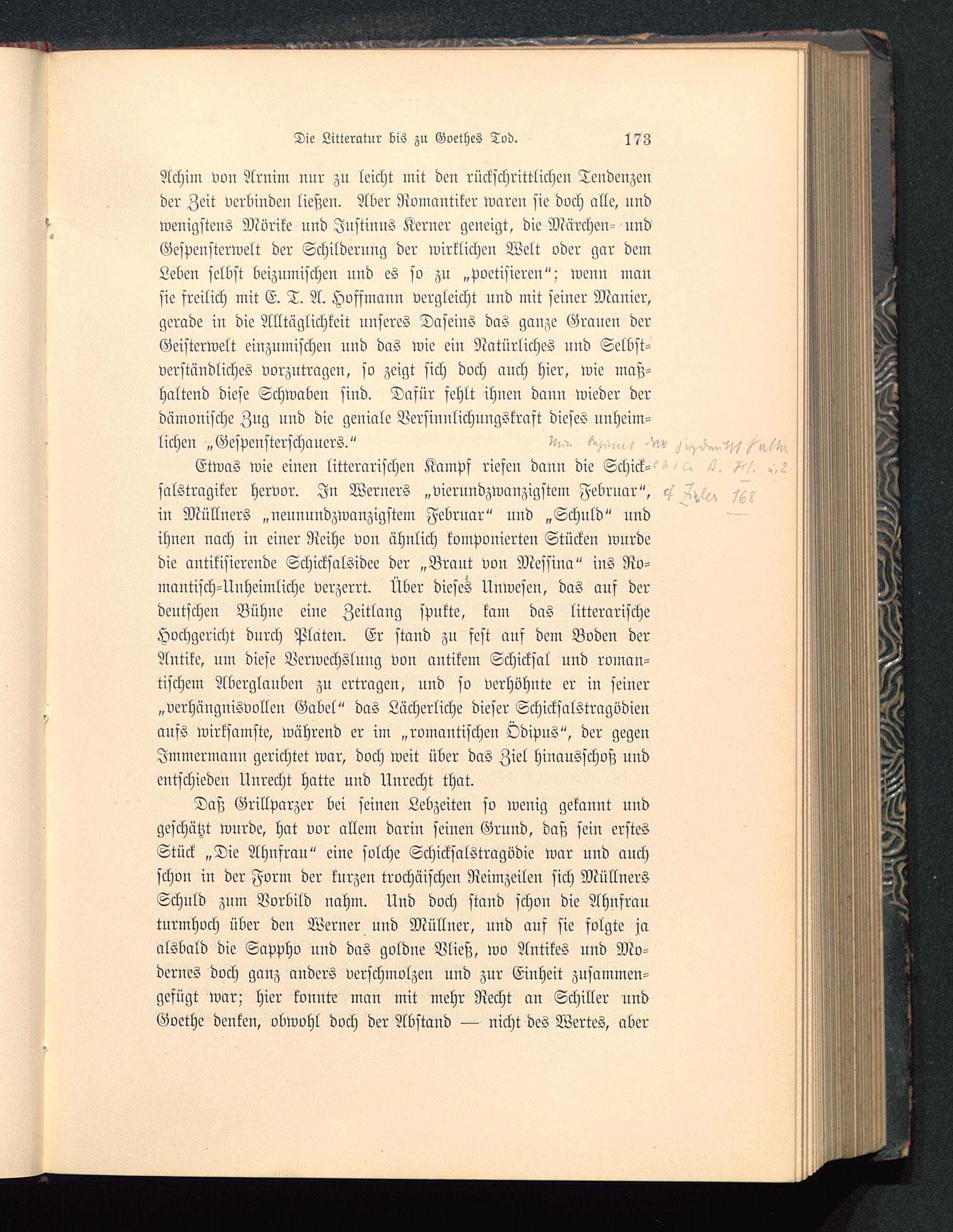 Etwas wie einen litterarischen Kampf riefen dann die Schick-salstragiker hervor. In Werners „vierundzwanzigstem Februar", <in Müllners „neunundzwanzigstem Febrnar" nnd „Schuld" undihnen nach in einer Reihe von ähnlich komponierten Stücken wnrdcdie antikisierende Schicksalsidee der „Braut von Messina " ins Ro-mantisch-Unheimliche verzerrt. Über dieses Unwesen, das auf derdeutschen Bühne eine Zeitlang spnkte, kam das litterarischeHochgericht durch Platen. Er stand zu fest auf dem Boden derAntike, um diese Verwechslung von antikem Schicksal nnd roman-tischem Aberglauben zu ertragen, und so verhöhnte er in seiner„verhängnisvollen Gabel" das Lächerliche dieser Schicksalstragödienaufs wirksamste, während er im „romantischen Odipns", der gegenJmmermann gerichtet war, doch weit über das Ziel hinausschoß nndentschieden Unrecht hatte und Unrecht that.