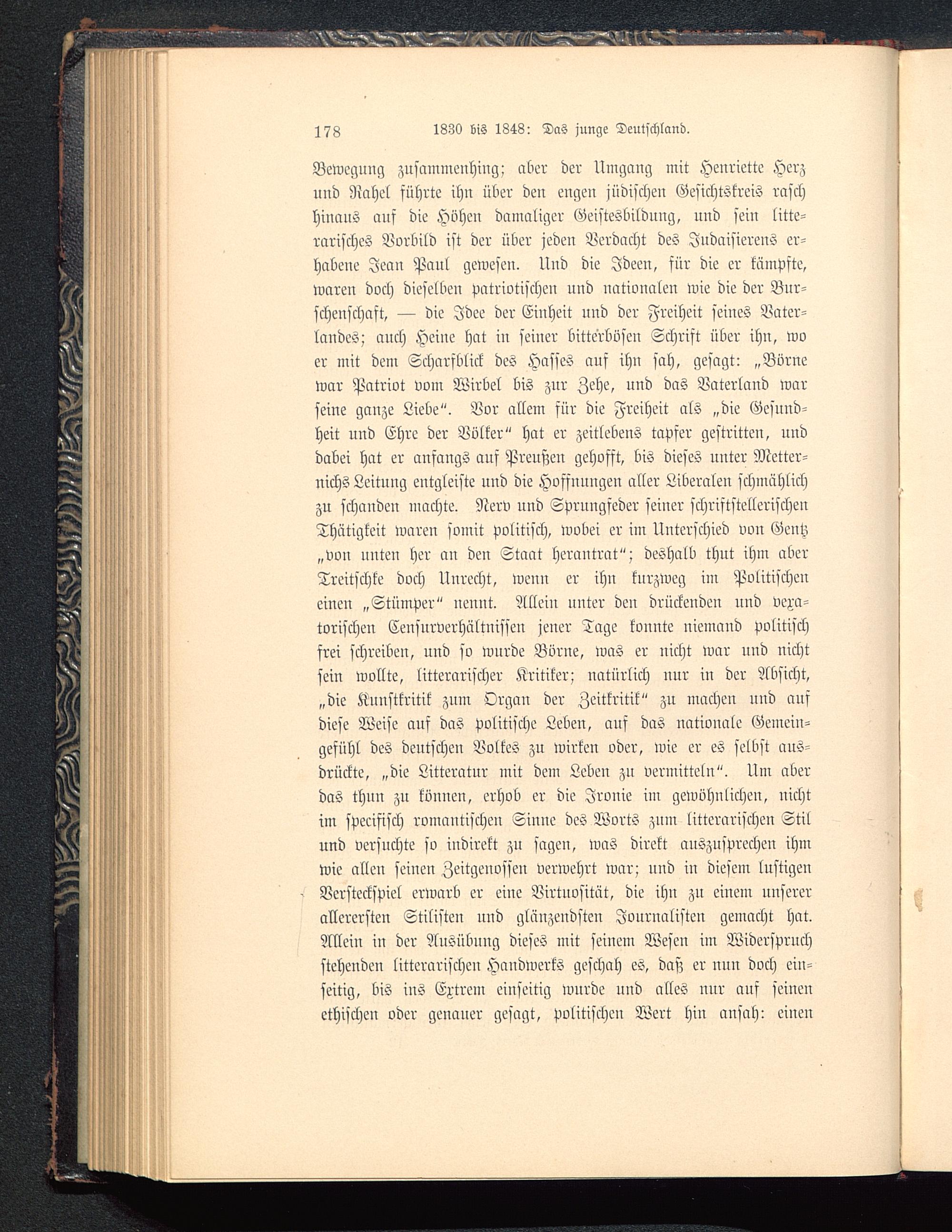 Bewegung zusammenhing: aber der Umgang mit Henriette Herz und Nahel führte ihn über den engen jüdischen Gesichtskreis raschhinaus auf die Höheu damaliger Geistesbildung, nnd sein litte-rarisches Vorbild ist der über jeden Verdacht des Judaisiereus er-habene Jean Paul gewesen. Und die Ideen, sür die er kämpfte,waren doch dieselben patriotischen und nationalen wie die der Bur-scheuschaft, — die Idee der Eiuheit und der Freiheit feines Vater-landes; auch Heiue hat iu seiner bitterbösen Schrist über ihn, woer mit dem Scharfblick des Hasses auf ihu sah, gesagt: „Bornewar Patriot vom Wirbel bis zur Zehe, und das Vaterland warseine gauze Liebe". Vor allem sür die Freiheit als „die Gesund-heit und Ehre der Völker" hat er zeitlebens tapser gestritten, unddabei hat er anfangs auf Preußen gehofft, bis dieses unter Metter-nichs Leitung entgleiste und die Hoffnungen aller Liberalen schmählichzu schänden machte. Nerv und Sprungfeder feiner schriftstellerischenThätigkeit wareu somit politisch, wobei er im Unterschied von Gentz„von uuteu her an den Staat herantrat"; deshalb thut ihm aberTreitschke doch Unrecht, wenn er ihn knrzweg im Politischeneinen „Stümper" nennt. Allein unter den drückenden nnd vexa-torischen Censurverhältnisseu jeuer Tage konnte niemand politischfrei schreiben, uud so wurde Börue, was er nicht war und uichtsein wollte, litterarischer Kritiker; natürlich nur in der Absicht,„die Kunstkritik zum Organ der Zeitkritik" zu machen nnd ausdiese Weise auf das politische Leben, auf das nationale Gemein-gefühl des deutschen Volkes zu wirken oder, wie er es selbst aus-drückte, „die Litteratur mit dem Leben zu vermitteln". Um aberdas thun zu können, erhob er die Ironie im gewöhnlichen, nichtim speeisisch romantischen Sinne des Worts zum litterarischen Stilund versuchte so indirekt zu sagen, was direkt auszusprechen ihmwie allen seinen Zeitgenossen verwehrt war; uud iu diesem lustigenVersteckspiel erwarb er eine Virtuosität, die ihu zu eiuem unsererallerersten Stilisten nnd glänzendsten Journalisten gemacht hat.Allein in der Ausübung dieses mit seinem Wesen im Widerspruchstehenden litterarischen Handwerks geschah es, daß er nun doch ein-seitig, bis ius Extrem einseitig wurde uud alles nur aus seiueuethischen oder genauer gesagt, Politischen Wert hin ansah: einen