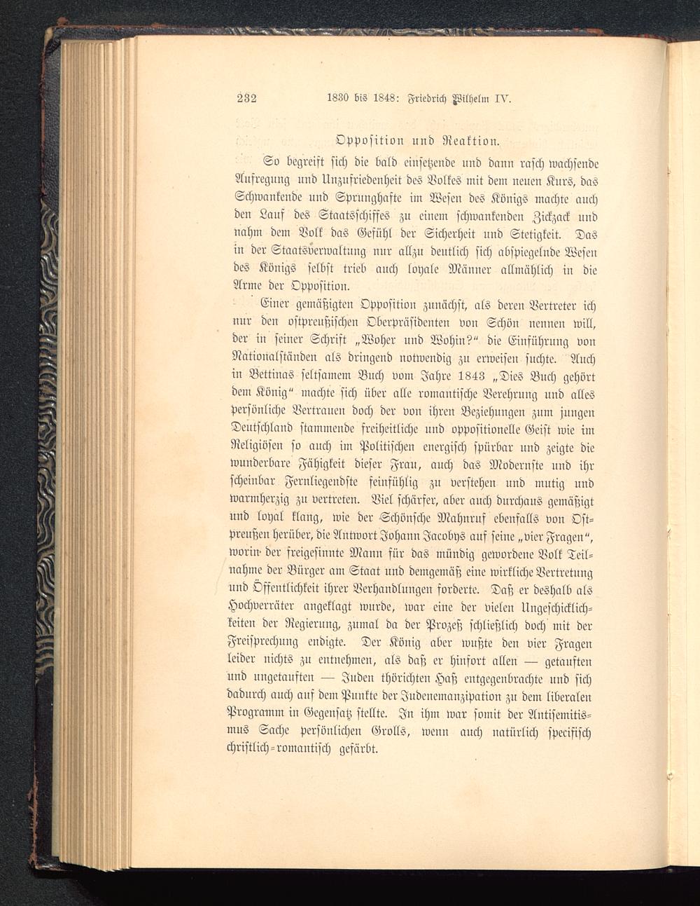Einer gemäßigten Opposition zunächst, als deren Vertreter ichnur den ostprenßischen Oberpräsidenten von Schön nennen will,der in seiner Schrift „Woher und Wohin?" die Einführung vonNationalständen als dringend notwendig zu erweiseu suchte. Auchin Bettinas seltsamem Buch vom Jahre 1843 „Dies Bnch gehörtdem König" machte sich über alle romantische Verehrung und allespersönliche Vertrauen doch der von ihren Beziehungen zum juugeuDeutschland stammende freiheitliche nnd oppositionelle Geist wie imReligiösen fo auch im Politischen energisch spürbar und zeigte diewunderbare Fähigkeit dieser Frau, auch das Modernste und ihrscheinbar Fernliegendste feinfühlig zu verstehen uud mutig undwarmherzig zu vertreten. Viel schärfer, aber anch durchaus gemäßigtund loyal klang, wie der Schönsche Mahnruf ebenfalls von Ost-preußen herüber, die Autwort Johanu Jaevbys ans seine „vier Fragen",worin der freigesinnte Mann für das mündig gewordene Volk Teil-nahme der Bürger am Staat und demgemäß eine wirkliche Vertretungund Öffentlichkeit ihrer Verhandlungen forderte. Daß er deshalb alsHochverräter angeklagt wurde, war eine der vielen Ungeschicklich-keiten der Regierung, znmal da der Prozeß schließlich doch mit derFreisprechung endigte. Der König aber wußte den vier Fragenleider nichts zu entnehmen, als daß er Hinsort allen — getauftenund uugctaufteu — Juden thörichten Haß entgegenbrachte nnd sichdadurch anch auf dem Punkte der Judenemauzipation zu dem liberalenProgramm in Gegensatz stellte. In ihm war somit der Antisemitis-mus Sache persönlichen Grolls, wenn anch natürlich specifischchristlich - romantisch gesärbt.