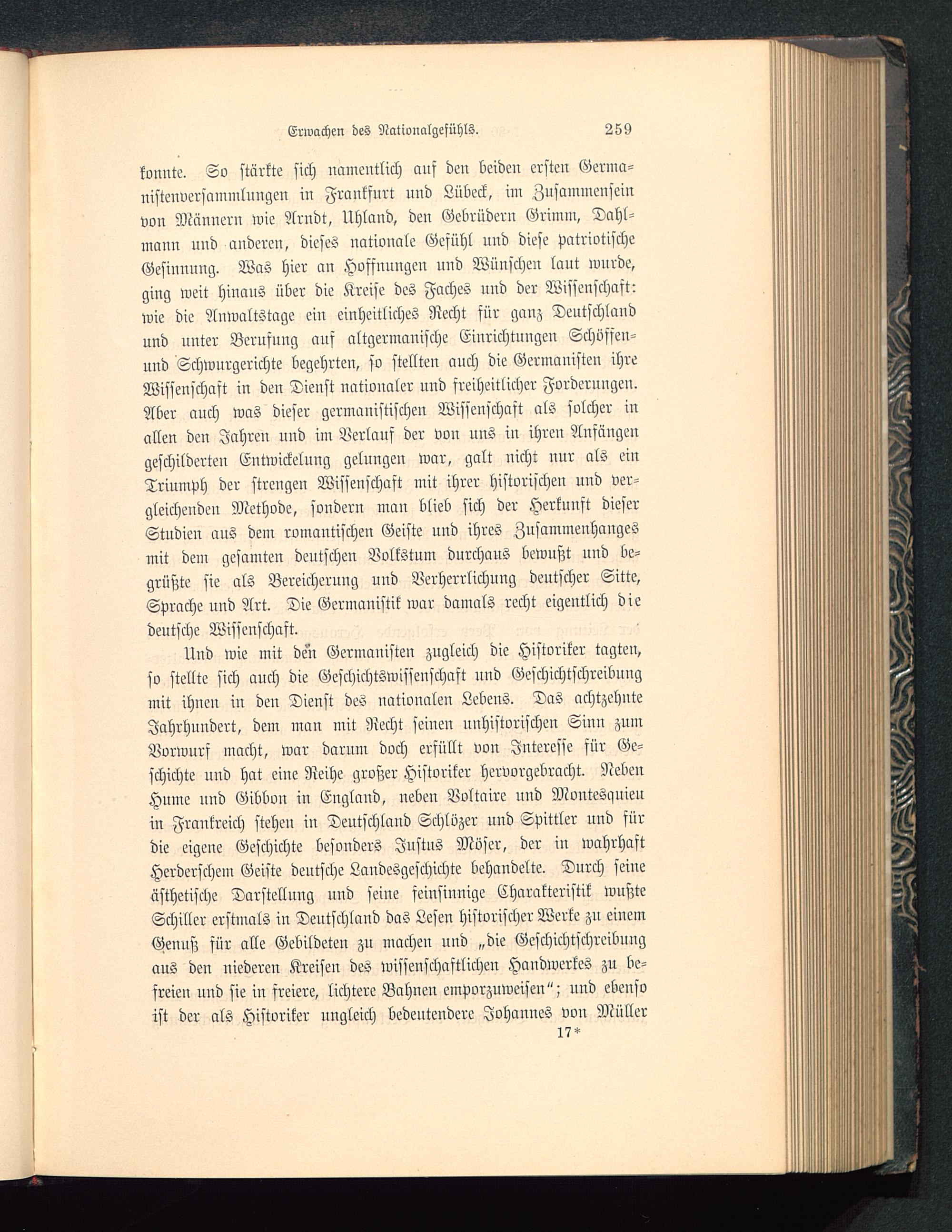 Und wie mit den Germanisten zugleich die Historiker tagteu,so stellte sich auch die Geschichtswissenschaft und Geschichtschreibungmit ihnen in den Dienst des nationalen Lebens. Das achtzehnteJahrhundert, dem man mit Recht seinen unhistorischen Sinn zumBorwurf macht, war darum doch erfüllt von Interesse für Ge-schichte und hat eine Reihe großer Historiker hervorgebracht. NebenHume und Gibbou iu England, neben Voltaire und Montesquieu in Frankreich stehen in Deutschland Schlözer und Spittler und fürdie eigene Geschichte besonders Justns Mvser, der iu wahrhaftHerderschem Geiste deutsche Laudesgeschichte behandelte. Durch seiueästhetische Darstellung uud seiue feinsinnige Charakteristik wußteSchiller erstmals in Deutschland das Lesen historischer Werke zu eiuemGenuß für alle Gebildeten zn machen und „die Geschichtschreibungaus den niederen Kreisen des wissenschaftlichen Handwerkes zu be-freien uud sie in freiere, lichtere Bahueu cmporzuweisen"; nnd ebenso