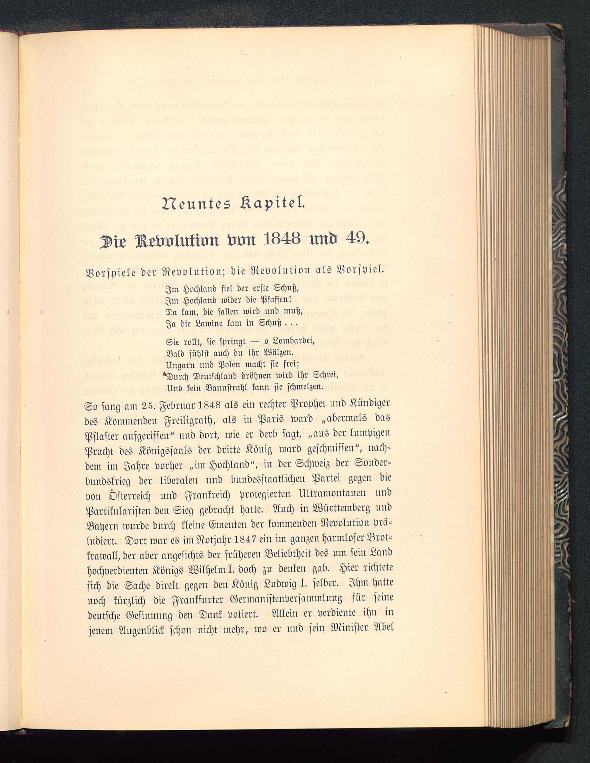 So sang am 25. Februar 1848 als ein rechter Prophet und Kündigerdes Kommenden Freiligrath, als in Paris ward „abermals dasPflaster aufgerissen" und dort, wie er derb sagt, „ans der lumpigenPracht des Königssaals der dritte König ward geschmissen", nach-dem im Jahre vorher „im Hochland", in der Schweiz der Sonder-bundskrieg der liberalem nnd bundesstaatlichen Partei gegen dievon Österreich und Frankreich protegierten Ultramontanen undPartikularisten den Sieg gebracht hatte. Auch in Württemberg undBayern wurde durch kleine Emeuteu der kommenden Revolution Prä-ludiert. Dort war es im Notjahr 1847 ein im ganzen harmloser Brot-krawall, der aber angesichts der früheren Beliebtheit des um sein Landhochverdienten Königs Wilhelm I. doch zn denken gab. Hier richtetesich die Sache direkt gegen den König Ludwig I. selber. Ihm hattenoch kürzlich die Frankfurter Germanistenversammlung sür seinedeutsche Gesinnung den Dank votiert. Allein er verdiente ihn injenem Augenblick schon nicht mehr, wo er und sein Minister Abel