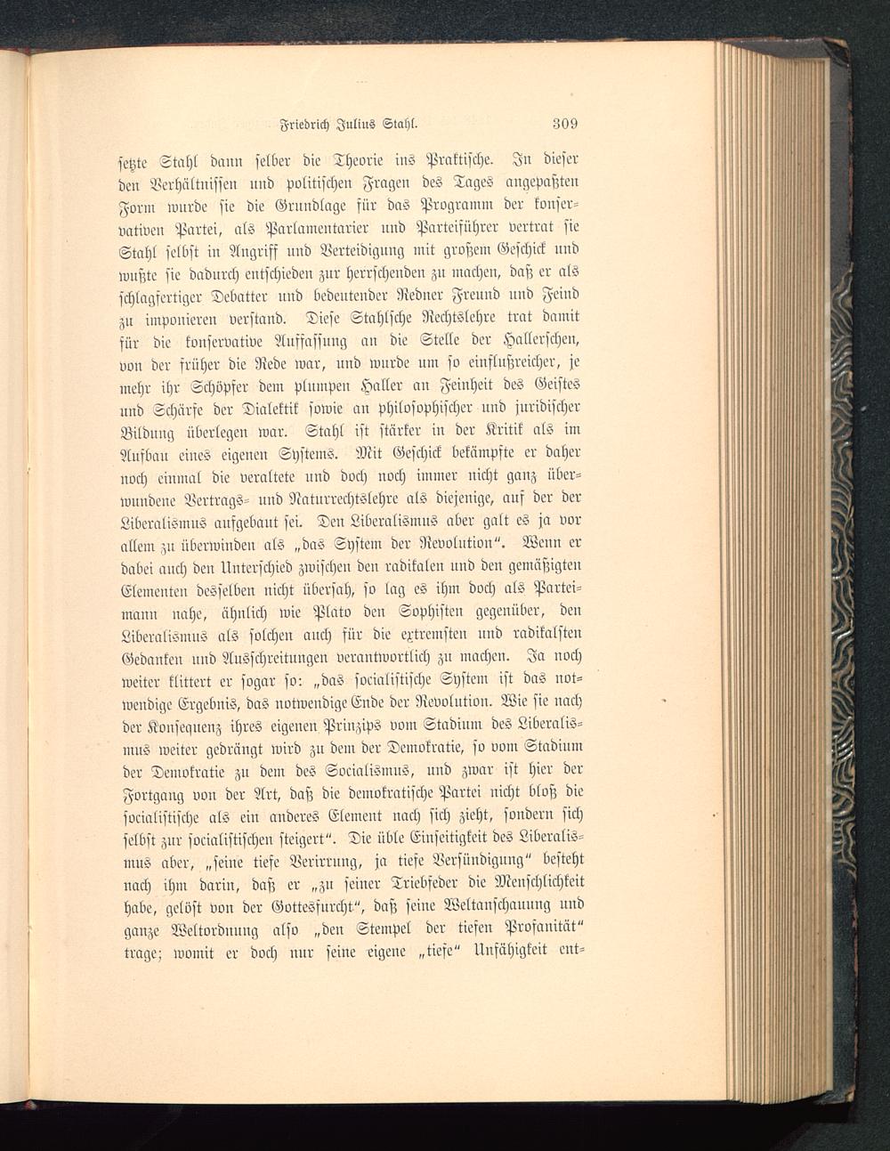 setzte Ztahl dann selber die Theorie ins Praktische. In dieserden Verhältnissen und politischen Fragen des TageS angepaßtenForm wnrde sie die Grundlage für das Programm der konser-vativen Partei, als Parlamentarier nnd Parteisührer vertrat sieStahl selbst in Angriff und Verteidigung mit großem Geschick nndwußte sie dadurch entschieden znr herrschenden zu machen, daß er alsschlagfertiger Debatter uud bedeutender Redner Freuud und Feindzu imponieren verstand. Diese Stahlsche Rechtslehre trat damitfür die konservative Anpassung an die Stelle der Hallerschen,von der früher die Rede war, und wurde um so einflußreicher, jemehr ihr Schöpfer dem plumpen Haller an Feinheit des Geistesund Schürfe der Dialektik sowie an Philosophischer und juridischerBildung überlegen war. Stahl ist stärker in der Kritik als imAusbau eiues eigenen Systems. Mit Geschick bekämpfte er dahernoch einmal die veraltete und doch noch immer nicht ganz über-wundene Vertrags- nnd Naturrechtslehre als diejenige, auf der derLiberalismus aufgebaut sei. Den Liberalismus aber galt es ja vorallem zu überwinden als „das System der Revolution". Wenn erdabei auch deu Unterschied zwischen den radikalen nnd den gemäßigtenElementen desselben nicht übersah, so lag es ihm doch als Partei-mann nahe, ähnlich wie Plato den Sophisten gegenüber, denLiberalismus als solchen auch für die extremsten uud radikalstenGedanken uud Ausschreitungen verantwortlich zu machen. Ja nochweiter klittert er sogar so: „das socialistische System ist das not-wendige Ergebnis, das notwendige Ende der Revolution. Wie sie nachder Konseanenz ihres eigenen Prinzips vom Stadium des Liberalis-mus weiter gedrängt wird zu dem der Demokratie, so vom Stadiumder Demokratie zu dem des Socialismns, und zwar ist hier derFortgang von der Art, daß die demokratische Partei nicht bloß diesocialistische als ein anderes Element nach sich zieht, sondern sichselbst zur socialistischen steigert". Die üble Einseitigkeit des Liberalis-mus aber, „seiue tiefe Verirrung, ja tiefe Versündigung" bestehtnach ihm darin, daß er „zu seiner Triebfeder die Menschlichkeithabe, gelöst von der Gottesfnrcht", daß seine Weltanschauung uudganze Weltordnung also „den Stempel der tiefeu Profauität"trage: womit er doch nur seine eigene „tiefe" Unfähigkeit cnt-