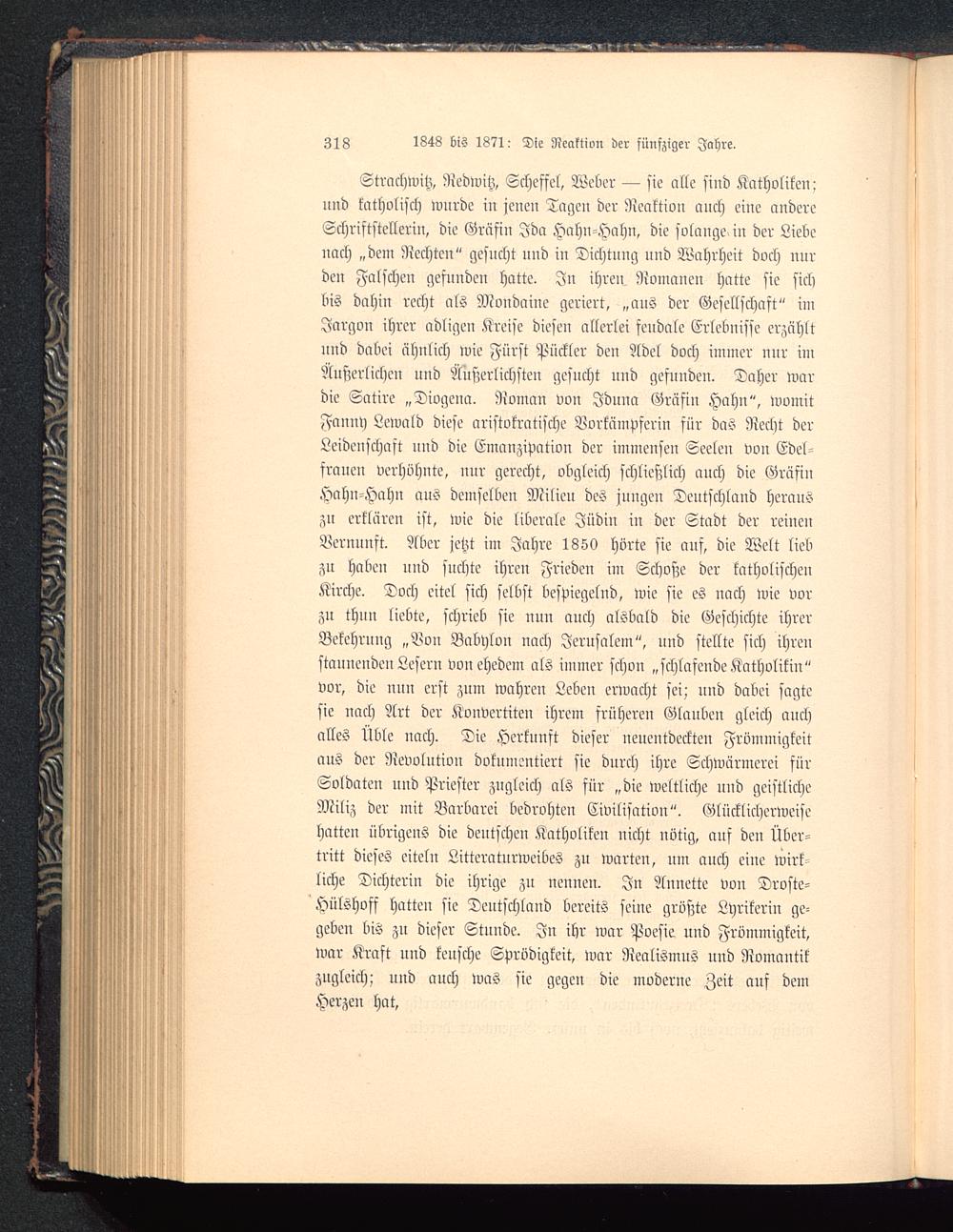 Strachwitz, Redwitz , Scheffel, Weber — sie alle sind Katholikeinund katholisch wurde in jenen Tagen der Reaktion auch eine andereSchriftstellerin, die Gräfin Jda Hahn-Hahn, die solange, in der Liebenach „dem Rechten" gesucht und in Dichtung und Wahrheit doch nnrden Falschen gefunden hatte. In ihren Romanen hatte sie sichbis dahin recht als Mondaine geriert, „aus der Gesellschaft" imJargon ihrer adligen Kreise diesen allerlei feudale Erlebnisse erzähltnnd dabei ähnlich wie Fürst Pückler den Adel doch immer nur imÄußerlichen und Äußerlichsten gesucht und gefunden. Daher wardie Satire „Diogeua. Roman von Jdnna Gräfin Hahn", womitFanny Lewald diese aristokratische Vorkämpferin für das Recht derLeideuschaft und die Emanzipation der immensen Seelen von Edel-sranen verhöhnte, nur gerecht, obgleich schließlich auch die GräfinHahu-Hahn aus demselben Milieu des jungen Deutschland herauszu erklären ist, wie die liberale Jüdin in der Stadt der reinenVernunft. Aber jetzt im Jahre 18S0 hörte sie aus, die Welt liebzu haben und suchte ihren Frieden im Schoße der katholischenKirche . Doch eitel sich selbst bespiegelnd, wie sie es nach wie vorzu thun liebte, schrieb sie nun auch alsbald die Geschichte ihrerBekehrung „Von Babylon nach Jerusalem", und stellte sich ihrenstaunenden Lesern von ehedem als immer schon „schlafende Katholikin"vor, die nun erst zum wahren Leben erwacht sei; und dabei sagtesie nach Art der Konvertiten ihrem früheren Glauben gleich auchalles Üble nach. Die Herkunft dieser neuentdeckten Frömmigkeitaus der Revolution dokumentiert sie durch ihre Schwärmerei fürSoldaten und Priester zugleich als für „die weltliche und geistlicheMiliz der mit Barbarei bedrohten Civilisation". Glücklicherweisehatten übrigens die deutschen Katholiken nicht nötig, auf den Über-tritt dieses eiteln LitteratnrweibeS zu warteu, um auch eine wirkliche Dichterin die ihrige zu nennen. In Annette von Droste-Hülshoff hatten sie Deutschland bereits seine größte Lyrikerin ge-geben bis zn dieser Stnnde. In ihr war Poesie und Frömmigkeit,war Kraft und keusche Sprödigkeit, war Realismus und Romantikzugleich; und auch was sie gegen die moderne Zeit auf demHerzen hat,