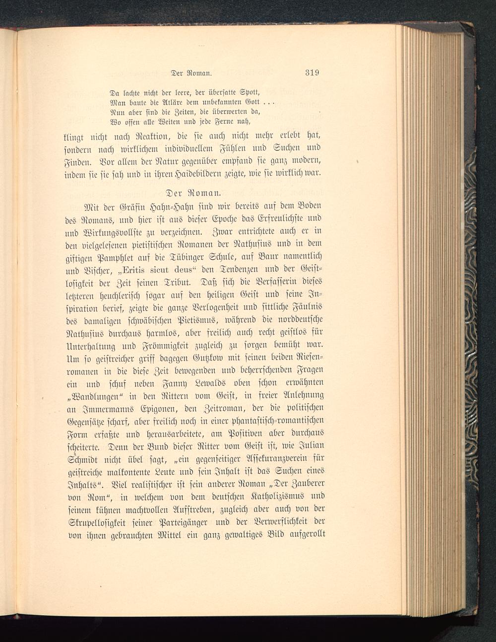 Mit der Gräfin Hahn-Hahn sind wir bereits aus dem Bodendes Romans, und hier ist aus dieser Epoche das Erfreulichste undund Wirkungsvollste zu verzeichnen. Zwar entrichtete auch er inden viclgeleseueu pietistischeu Romanen der Nathusius und in demgiftigen Pamphlet auf die Tübinger Schule, auf Baur namentlichund Bischer, „Lritig 8ivnt clsus" den Tendenzen und der Geist-losigkeit der Zeit seinen Tribut. Daß sich die Berfasserin diesesletzteren heuchlerisch sogar aus den heiligen Geist und seine In-spiration berief, zeigte die ganze Verlogenheit nnd sittliche Fäulnisdes damaligen schwäbischen Pietismus, während die nvrddentscheNathusinS durchaus harmlos, aber sreilich auch recht geistlos sürUnterhaltung und Frömmigkeit zugleich zu sorgen bemüht war.Um so geistreicher griff dagegen Gntzkow mit seinen beiden Niesen-romanen in die diese Zeit bewegenden und beherrschenden Fragenein nnd schuf neben Fanny Lewalds oben schon erwähnten„Wandlungen" iu den Rittern vom Geist, in freier Anlehnungan Jmmermauus Epigonen, den Zeitroman, der die politischenGegensätze scharf, aber freilich noch in einer phantastisch-rontantischeitForm erfaßte und herausarbeitete, am Positiven aber durchausscheiterte. Denn der Bnnd dieser Ritter vom Geist ist, wie JuliauSchmidt nicht übel sagt, „ein gegenseitiger Assekuranzverein fürgeistreiche malkontente Leute und sein Inhalt ist das Suchen einesInhalts". Viel realistischer ist sein anderer Roman „Der Zauberervon Rom", iit welchem von dem deutschen Katholizismus undseinem kühnen machtvollen Ausstreben, zugleich aber auch von derSkrupellosikeit seiner Parteigänger uud der Verwerflichkeit dervon ihnen gebrauchten Mittel ein ganz gewaltiges Bild aufgerollt