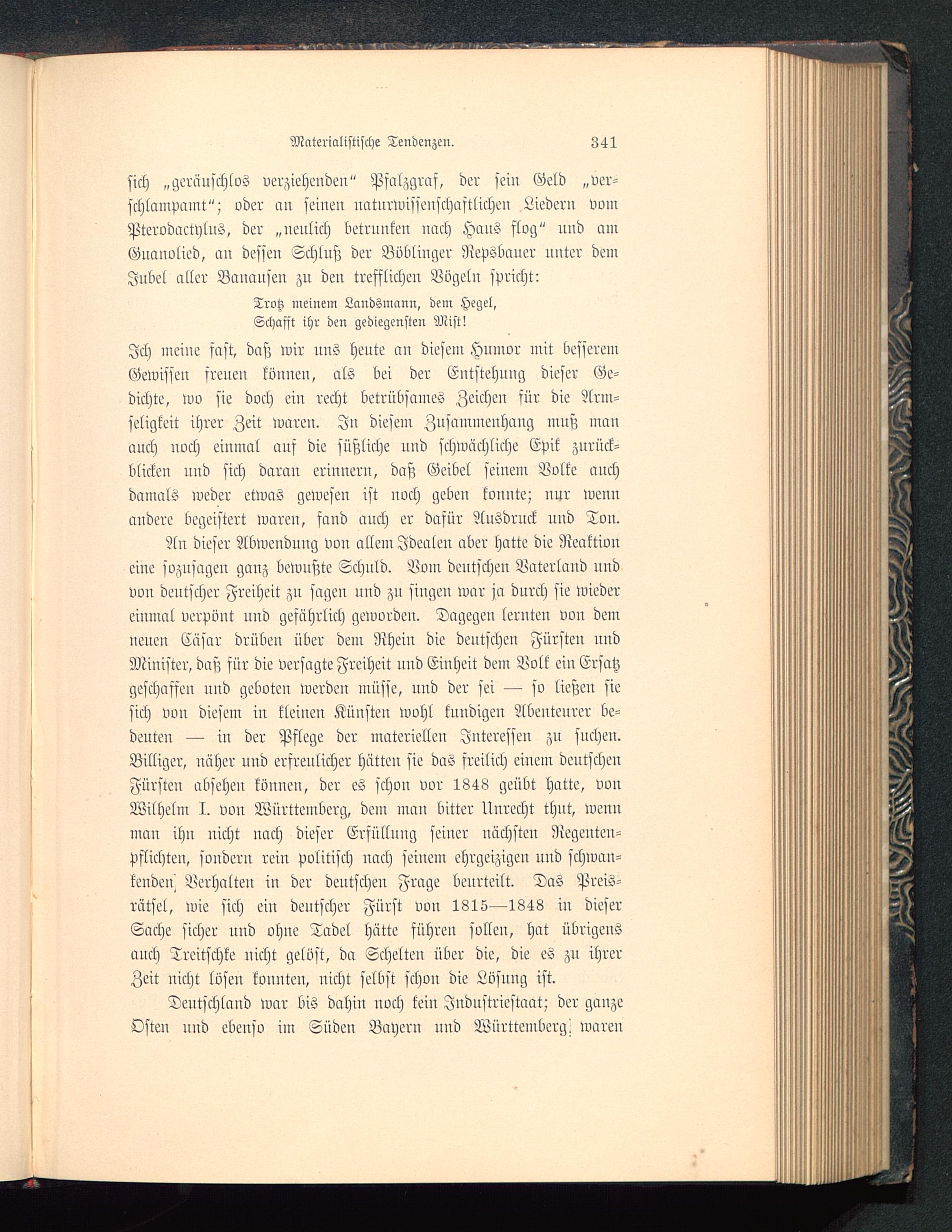 An dieser Abwendung von allem Idealen aber hatte die Reaktioneine sozusagen ganz bewußte Schuld. Vom deutschen Vaterland undvon deutscher Freiheit zu sagen uud zu singen war ja durch sie wiedereinmal verpönt nnd gefährlich geworden. Dagegen lernten von demneuen Cäsar drüben über dem Rhein die deutschen Fürsten undMinister, daß sür die versagte Freiheit und Eiuheit dem Volk ein Ersatzgeschaffen und geboten werden müsse, und der sei — so ließen siesich von diesem in kleinen Künsten wohl kundigen Abenteurer be-deuten — in der Pflege der materiellen Interessen zu suchen.Billiger, näher und erfreulicher hätten sie das sreilich einem deutschenFürsten abseheil köuueu, der es schau vor 1848 geübt hatte, vonWilhelm I. von Württemberg , dem man bitter Unrecht thut, wennman ihn nicht nach dieser Ersüllung seiner nächsten Regenten-pflichten, sondern rein politisch nach seinem ehrgeizigen uud schwan-kenden Verhalten in der deutschen Frage beurteilt. Das Preis-rätsel, wie sich eiu deutscher Fürst von 1815—1848 iu dieserSache sicher und ohne Tadel hätte führen sollen, hat übrigensauch Treitschke nicht gelöst, da Schelten über die, die es zu ihrerZeit nicht lösen konnten, nicht selbst schon die Lösung ist.