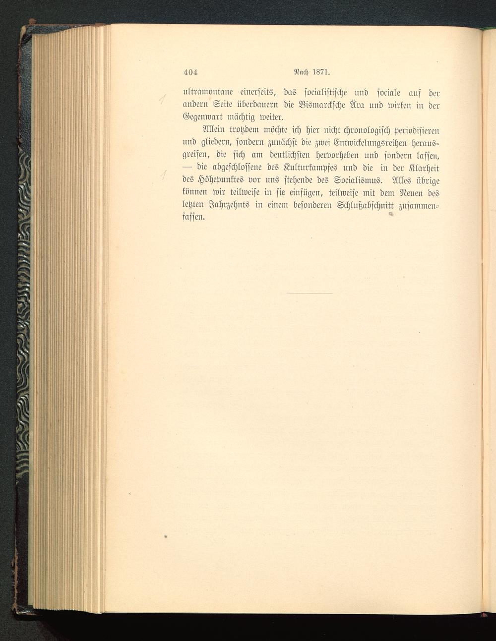 Allein trotzdem möchte ich hier nicht chronologisch periodisierennnd gliedern, sondern zunächst die zwei Entwickelungsreihen heraus-greifen, die sich am deutlichstem hervorheben und sondern lassen,— die abgeschlossene des Kulturkampfes und die in der Klarheitdes Höhepunktes vor nns stehende des Socialismus. Alles übrigekönnen wir teilweise in sie einfügen, teilweise mit dem Neuen desletzten Jahrzehnts in einem besonderen Schlußabschnitt zusammen-fassen.