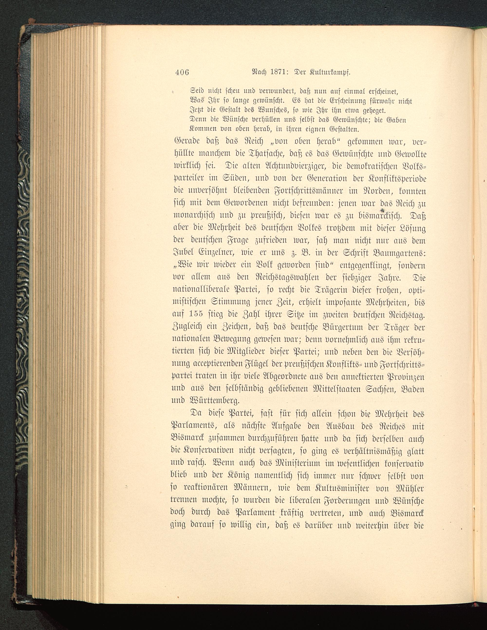 Da diese Partei, fast für sich allein schon die Mehrheit desParlaments, als nächste Aufgabe den Ausbau des Reiches mitBismarck zusammen durchzuführen hatte und da sich derselben anchdie Kouservativeu nicht versagteil, so ging es verhältmsmäßig glattnnd rasch. Wenn anch das Ministerium im weseutlicheu konservativblieb und der König namentlich sich immer nur schwer selbst vonsv reaktionären Männern, wie dem Kultusminister von Mühlertrennen mochte, so wurden die liberalem Forderuugeu uud Wünschedoch durch das Parlament kräftig vertreten, und auch Bismarckging darauf so willig ein, daß es darüber nnd weiterhin über die