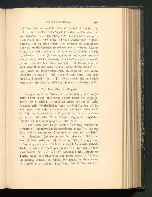 Dagegen ward im Augenblick der Entstehung des Reichesmitten hinein in das innere Leben unseres Volkes eine Frage ge-worfen, die es wirklich zu zerklüften drohte, die nns ein vollesJahrzehnt aufs leidenschaftlichste erregt uud beschäftigt hat und dieauch heute noch unser nationales nnd politisches Leben leidigbeeinflußt und beherrscht — die Frage, wie sich der deutsche Staatzu dem am 18. Jnli 1870 verkündigten Dogma der päpstliche»Unfehlbarkeit und seinen Folgen zu stellen habe.