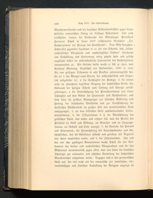 Menschenverstandes und der deutschen Wissenschastlichkeit gegen diesenheillosen romanischen Unsug ein kräftiger Widerstand. Und nochernsthafter lautete die Einsprache des Würzburger ProfessorsHermann Schell iu feiuer 1897 erschienenen Broschüre „DerKatholizismus als Prinzip des Fortschritts". Dem Miß-Baughau-.Schwindel gegenüber bezeichnet er es als eine Schande, daß „solcherunchristlicher Aberglaube und mythologischer Unsinn" überhaupteine Enthütluug und Entlarvung nötig gehabt habe und gestehtangesichts dessen die misseuschaftliche Juferiorität des Katholizismus»numwnnden zu. Als Gründe dafür macht er sich zn eigen, wasKardinal Mauniug, Erzbischos vou Westminster, 1890 in einerArt von geistigem Testament in acht Punkten zusammengefaßt hat.Es sei 1. der Mangel eines Klerus, der wisseuschaftlich uud bürger-lich vollgcbildet sei; 2. die Seichtigkeit der Predigt; 3. die immermehr im Zunehmen begriffene Neiguug der katholischen Kreise, denGebranch der heiligen Schrift nach Umfang und Energie zurück-zudrängen; 4. die Unterschätznng des Protestantismus und seinerThätigkeit auf dem Gebiet der Humanität und Nächstenliebe, nnddoch seien die größten Bewegungen-zur sittlichen Besserung undHebung der bestehenden Übelstände und zur Durchführung derchristlichen Nächstenliebe im großen Stil von protestantischer Seiteausgegangen; 5. ein dem biblischen Geist zuwiderlaufender Sakra-mentnlismus; 6. der Offizialismus d. h. die Überschätzung desgeistlichen Amts, das decken und ersetzen soll, was der Person desPriesters an Geist und Bildung, an Gründen und an Umgangs-formen, an Geduld uud Liebe mangle; 7. die Vorliebe für Polemilund Kontroverse, für Hervorhebung des Unterscheidenden nnd Ge-schöpflichcn, das die Gebildeten abstoße nnd geradezu als Ärgernisvon ihnen empfunden werde, uud 8. der Jesuiteuordeu. Jhu uuddeu vou ihm gepflegten RomanismnS macht Schell für das Auf-kommen des derbeu uud uuchristlicheu Aberglaubens und für dasMißtranen verantwortlich gegen alles, was von selten der deutschenTheologie zur rationalen und ethischen Pertiefnng der katholischenGlaubenslehre aufgeboten werde. Dagegen rnft er den germanischenGeist auf, der viel mehr als der romanische zur innerlichen, ver-nnnstmäßigen und sittlichen Auffafsnng der Religion angelegt sei