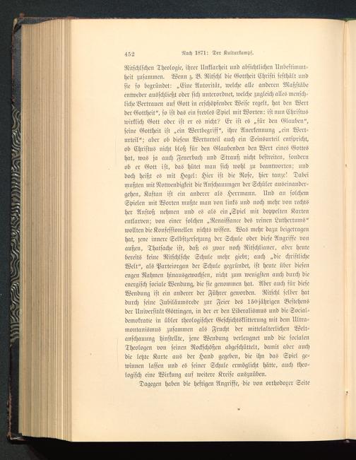 Ritschlschen Theologie, ihrer Unklarheit und absichtlichen Unbestimmt-heit zusammen. Wenn z. B. Ritschl die Gottheit Christi sesthült undsie so begründet: „Eine Autorität, welche alle anderen Maßstäbeentweder ausschließt oder sich unterordnet, welche zugleich alles mensch-liche Vertrauen auf Gott in erschöpfender Weise regelt, hat den Wertder Gottheit", so ist das ein frevles Spiel mit Worten: ist nun Christuswirklich Gott oder ist er es nicht? Er ist es „für den Glauben",seine Gottheit ist „ein Wertbegriss", ihre Anerkennung „eiu Wert-urteil"; aber ob diesem Werturteil auch ein Seinsurteil entspricht,ob Christus nicht bloß für den Glaubenden den Wert eines Gotteshat, was ja auch Feuerbach und Strauß nicht bestreiteu, soudernob er Gott ist, das hütet man sich wohl zn beantworten: nnddoch heißt es mit Hegel : Hier ist die Rose, hier tanze! Dabeimußten mit Notwendigkeit die Anschauungen der Schüler auseinander-gehen, Kaftan ist ein anderer als Herrmann. Und an solchemSpielen mit Worten mußte man von links und noch mehr von rechtsher Anstoß nehmen und es als ein »Spiel mit doppelten Kartenentlarven; von einer solchen „Renaissance des reinen Luthertums"wollten die Konfessionellen nichts wissen. Was mehr dazu beigetragenhat, zene innere Selbstzcrsetzuug der Schule oder diese Augrisfe vonaußen, Thatsache ist, daß es zwar noch Ritschlinner, aber heutebereits keine Ritschlsche Schule mehr giebt; auch „die christlicheWelt", als Parteiorgan der Schnle gegründet, ist heute über diesenengen Nahmen hinausgewachsen, nicht zum wenigstem auch durch dieenergisch sociale Wendung, die sie genommen hat. Aber auch sür dieseWendung ist ein anderer der Führer geworden. Ritschl selber hatdurch seine Jnbilänmsrede zur Feier des 150 jährigen Bestehensder Uuiversitüt Göttingen, in der er den Liberalismus uud die Social-demokratie in übler theologischer Geschichtsklitterung mit dem Ultra-montanismns zusammen als Frucht der mittelalterlichen Welt-anschannng hinstellte, jene Wendung verleugnet nnd die socialenTheologen von seinen Rockschößen abgeschüttelt, damit aber auchdie letzte Karte aus der Hand gegeben, die ihn das Spiel ge-winnen lassen nnd es seiner Schule ermöglicht hätte, auch theo-logisch eine Wirkung ans weitere Kreise auszuüben.