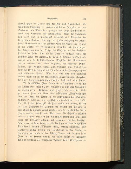 Die socialistischen Ideen sind auch in Deutschland so alt alsdas Jahrhundert selber ist, wir brauchen hier nur schon Erwähnteszu rekapituliereu. Pestalozzi und Fichte sind in erster Liniezn uennen: jener mit seinen 1797 erschienenen „Nachforschungenüber den Gang der Natur in der Entwickelung des Menschen-geschlechts", dieser mit dem „geschlossenen Handelsstaat" von 1800.Aber die sociale Pädagogik, die jener wollte und meinte, ist erstim letzten Jahrzehnt des Jahrhunderts erkannt und als eine zuverwirklichende Ausgabe erfaßt wordeu, und die socialistischen JdeeuFichtes wurden, als sie ans Licht traten, für Schrullen gehaltenuud ihr Urheber wird vou deu Nationalökonomen anch heute nochkaum als Borläufer gekannt und genannt. In den dreißigerJahren war es dann Heine, der die Deutschen mit dem srauzösischenSocialismus bekannt zu machen suchte, deutsche Flüchtlinge undHandwerkslmrschen lernten den Socialismus au der Lmelle, inFrankreich oder auch in der Schweiz kennen nnd brachten seineIdeen in die Heimat zurück; vor allem suchte der SchneiderWilhelm Weitling als energischer Agitator dafür Propaganda zu