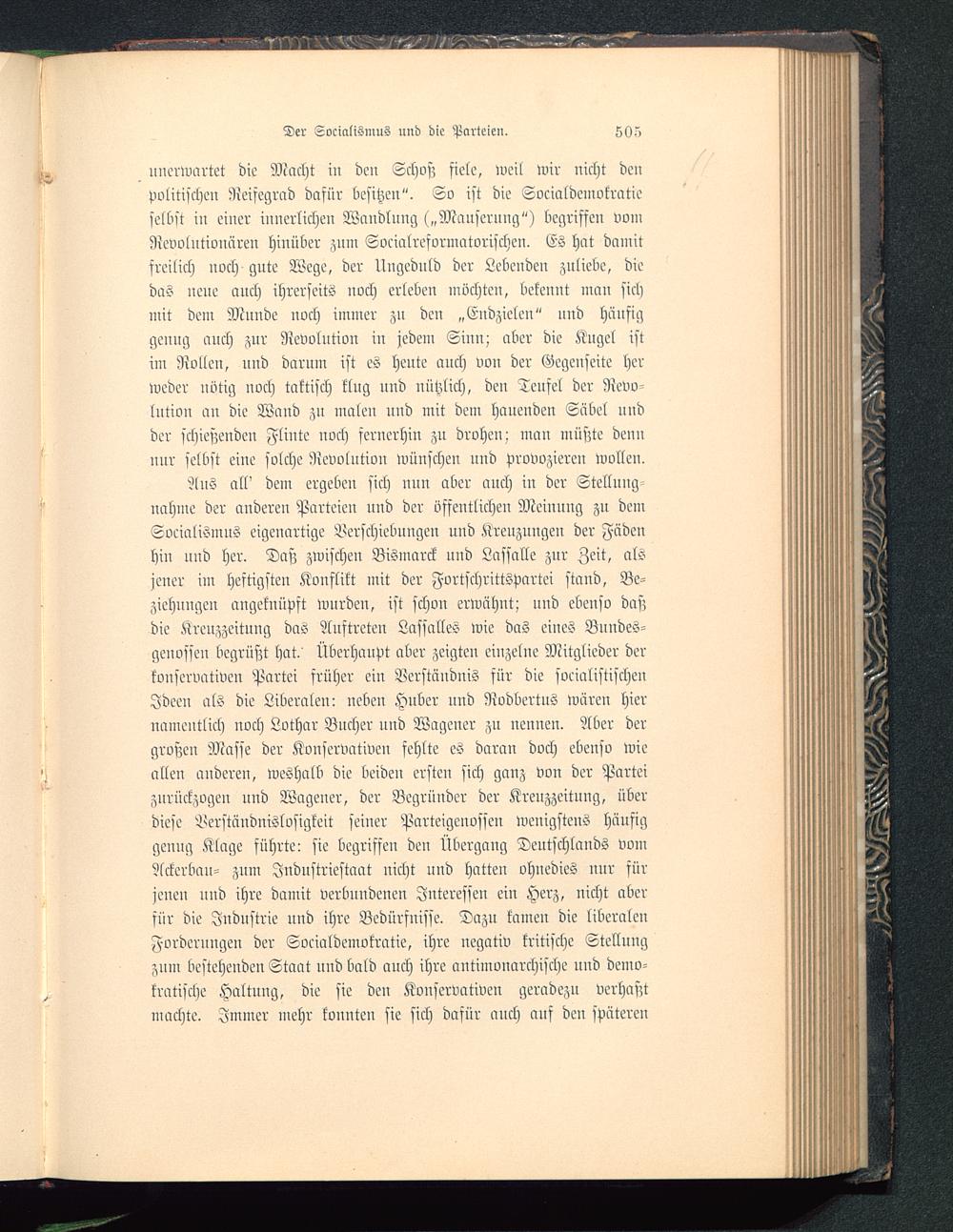 Ans all' dein ergeben sich nun aber auch in der Stellungnähme der anderen Parteien und der öffeutlichen Meiuuug zu demSocialismus eigenartige Verschiebungen uud Kreuzuugeu der Fädenhin und her. Daß zwischen Bismarck und Lassalle zur Zeit, alsjener im heftigsten Konflikt mit der Fortschrittspartei stand, Be-ziehungen angeknüpft wurdcu, ist schon erwähnt; nnd ebenso das;die Kreuzzeitung das Auftreten Lassalles wie das eiues Bundes-genossen begrüßt hat. Überhaupt aber zeigten einzelne Mitglieder derkonservativen Partei früher ein Verständnis für die socialistischenIdeen als die Liberalen: neben Huber und Rodbertus wären hiernamentlich noch Lothar Bncher nnd Wagener zu neuueu. Aber dergroßen Masse der Konservative fehlte es daran doch ebenso wieallen anderen, weshalb die beiden ersten sich ganz von der Parteizurückzogen uud Wagener, der Begründer der Kreuzzeitung, überdiese Verstäudnislosigkeit seiner Parteigenossen wenigstens häusiggenug Klage führte: sie begriffen den Übergang Deutschlands vomAckerbau- zum Industriestaat nicht und hatteu ohnedies nur fürjenen uud ihre damit verbundenen Interessen ein Herz, nicht abersür die Industrie uud ihre Bedürfnisse. Dazu kamen die liberalenForderungen der Socialdemokratie, ihre negativ kritische Stellungznm bestehenden Staat und bald auch ihre antimonarchische nnd demo-kratische Haltung, die sie den Konservativen geradezu verhaßtmachte. Immer mehr konnten sie sich dasür auch ans den späteren