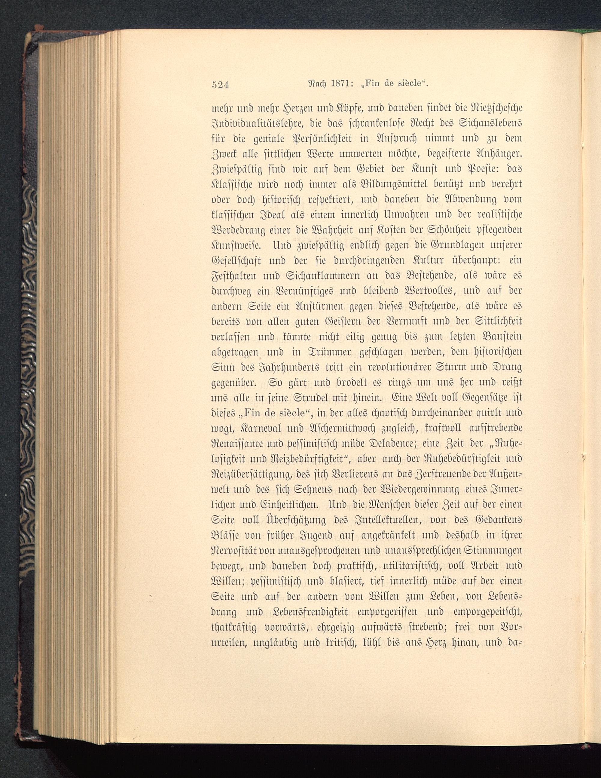 mehr und mehr Herzen und Köpfe, und daneben findet die NietzfchescheJndividualitätSlehre, die das schrankenlose Recht des Sichauslebeusfür die geniale Persönlichkeit iu Anspruch nimmt und zu demZweck alle sittlichen Werte umwerten möchte, begeisterte Anhänger.Zwiespältig sind wir aus dem Gebiet der Kunst uud Poesie: daSKlassische wird noch immer als Bildungsmittel benützt und verehrtoder doch historisch respektiert, und daneben die Abwendung vomklassischen Ideal als einem innerlich Unwahren und der realistischeWerdedrang einer die Wahrheit auf Kosten der Schönheit pflegendenKnnstweise. Nud zwiespältig endlich gegen die Grundlage» unsererGesellschast nnd der sie durchdringenden Kultur überhaupt: einFesthalten und Sichanklammern an das Bestehende, als wäre esdurchweg ein Vernünftiges uud bleibend Wertvolles, und auf derandern Seite eiu Anstürmen gegen dieses Bestehende, als wäre esbereits von allen guten Geistern der Vernunft und der Sittlichkeitverlassen und konnte nicht eilig genug bis zum letzten Bausteiuabgetragen und in Trümmer geschlagen werden, dem historischenSinn des Jahrhunderts tritt ein revolutionärer Sturm und Drang gegenüber. So gürt und brodelt es rings um uns her und reißtuns alle in seine Strudel mit hinein. Eine Welt voll Gegensätze istdieses „?ir> äs Asole", in der alles chaotisch durcheinander quirlt undwogt, Karneval und Aschermittwoch zugleich, krastvoll ausstrebendeRenaissance uud pessimistisch müde Dekadence; eine Zeit der „Ruhe-losigkeit uud Reizbedürstigkeit", aber auch der Nuhebedürftigkeit undReizübersättignng, des sich Verlierens an das Zerstreuende der Außen-welt und des sich Sehnens nach der Wiedergewinnung eines Inner-lichen und Einheitlichen. Und die Menschen dieser Zeit auf der eiuenSeite voll Überschätzung des Intellektuellen, von des GedankensBlässe von früher Jugend auf angekränkelt und deshalb in ihrerNervosität vou unausgesprochenen uud unaussprechlichen Stimmungenbewegt, nnd daneben doch praktisch, Militaristisch, voll Arbeit undWillen; pessimistisch und blasiert, tief innerlich müde auf der einenSeite und auf der andern vom Willen zum Leben, von Lebens-drang und Lebensfreudigkeit emporgerissen und emporgepeitscht,thatkrästig vorwärts, ehrgeizig auswärts strebend; frei von Vor-urteilen, ungläubig uud kritisch, kühl bis ans Herz hinan, nud da-