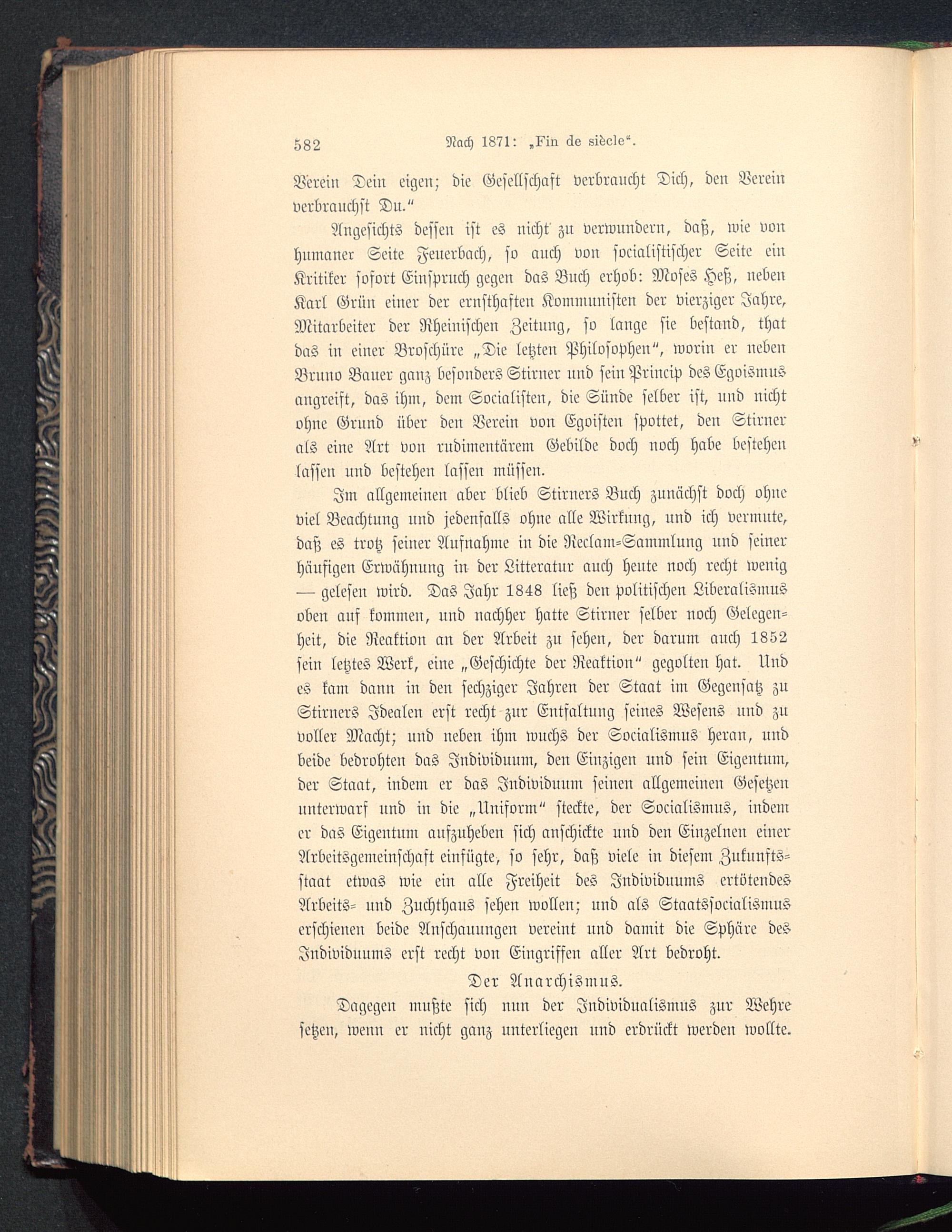 Angesichts dessen ist es nicht zn verwundern, daß, wie vonhumaner Seite Feuerbach, sv auch von soeialistischer Seite einKritiker sofort Einspruch gegen das Buch erhob: Moses Heß , nebenKarl Grüu einer der ernsthaften Kommunisten der vierziger Jahre,Mitarbeiter der Rheinischen Zeitnng, so lange sie bestand, thatdas in einer Broschüre „Die letzten Philosopheu", woriu er nebenBrnno Bauer gauz besonders Stirner und sein Princip des Egoismusangreift, das ihm, dem Socialisten, die Sünde selber ist, und nichtohne Grnnd über den Verein von Egoisten spottet, den Stirncrals eine Art von rudimentärem Gebilde doch noch habe bestehenlassen und bestehen lassen müssen.