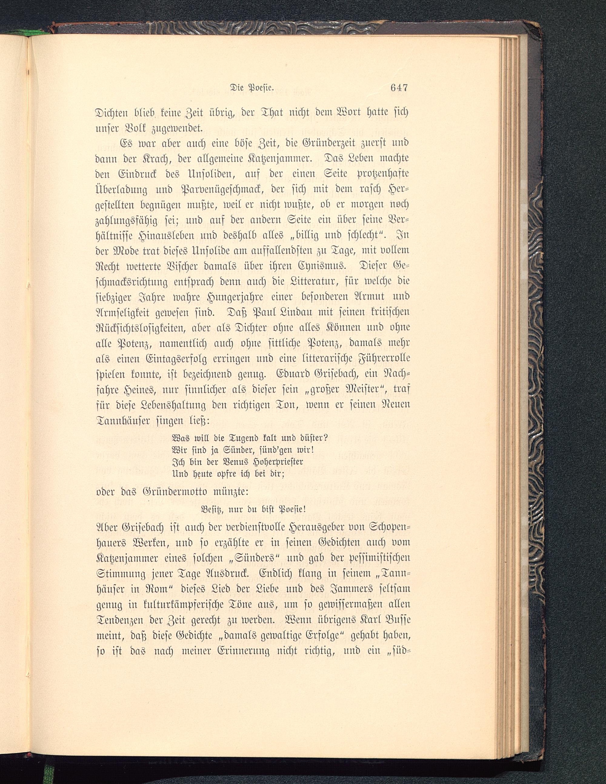 Aber Grisebach ist auch der verdienstvolle Herausgeber von Schopen-hauers Werken, und so erzählte er in seineu Gedichten auch vomKatzenjammer eines solchen „Sünders" und gab der pessimistischenStimmung jener Tage Ausdruck. Endlich klang in seinein „Tann-häuser in Rom " dieses Lied der Liebe uud des Jammers seltsamgenug in kultnrkämpserische Töne aus, um so gewissermaßen allenTendenzen der Zeit gerecht zu werde». Wenu übrigens Karl Busse meint, daß diese Gedichte „damals gewaltige Erfolge" gehabt haben,so ist das nach meiner Erinnerung nicht richtig, und ein „süd-