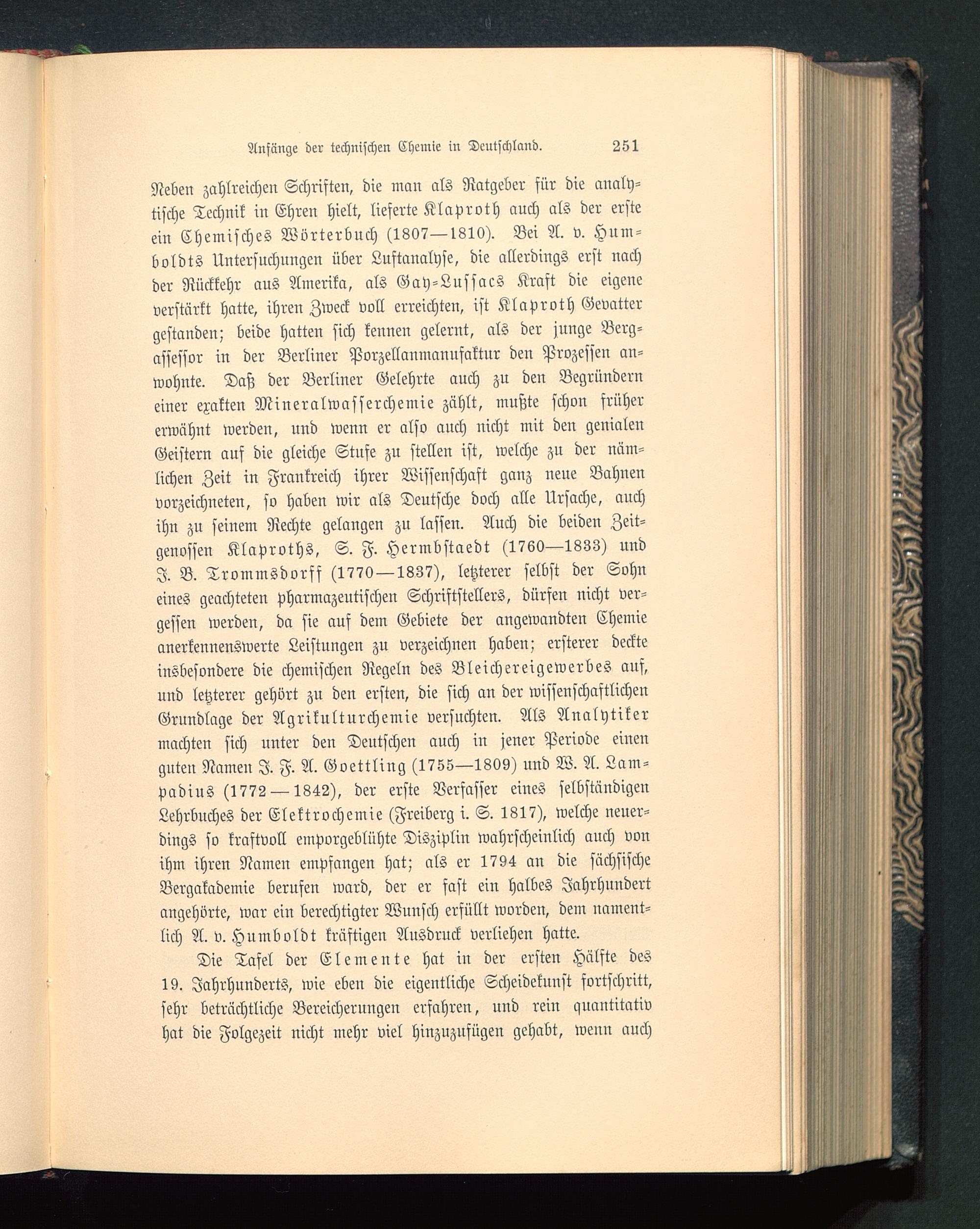 Neben zahlreichen Schriften, die man als Ratgeber für die analy-tische Technik in Ehren hielt, lieferte Klaproth auch als der ersteein Chemisches Wörterbuch (1807—1810). Bei A. v. Hum-boldts Untersuchungen über Luftanalyse, die allerdings erst nachder Rückkehr aus Amerika , als Gay-Lussacs Kraft die eigeneverstärkt hatte, ihren Zweck voll erreichten, ist Klaproth Gevattergestanden; beide hatten sich kennen gelernt, als der junge Berg-assessor in der Berliner Porzellanmannsaktur den Prozessen an-wohnte. Daß der Berliner Gelehrte auch zu den Begründerneiner exakten Mineralwasserchemie zählt, mußte schon frühererwähnt werden, und wenn er also auch nicht mit den genialenGeistern auf die gleiche Stufe zu stellen ist, welche zn der näm-lichen Zeit in Frankreich ihrer Wissenschaft ganz ueue Bahnenvorzeichneten, so haben wir als Deutsche doch alle Ursache, auchihn zu seinem Rechte gelangen zu lassen. Auch die beiden Zeit-genossen Klaproths, S. F. Hermbstaedt (1760—1833) undI. B. Trommsdorff (1770 — 1837), letzterer selbst der Sohneines geachteten pharmazeutischen Schriftstellers, dürfen nicht ver-gessen werden, da sie auf dem Gebiete der augewandten Chemieanerkennenswerte Leistungen zu verzeichnen haben; ersterer deckteinsbesondere die chemischen Regeln des Bleichereigewerbes ans,und letzterer gehört zu den ersten, die sich an der wissenschaftlichenGrundlage der Agrikulturchemie versuchten. Als Analytikermachten sich unter den Dentschen auch in jener Periode einenguten Namen I. F. A. Goettling (1755—1809) und W. A. Lam-padius (1772 —1842), der erste Versasser eiues selbständigenLehrbuches der Elektrochemie (Freiberg i. S. 1817), welche neuer-dings so kraftvoll emporgeblühte Disziplin wahrscheinlich auch vonihm ihren Namen empfangen hat; als er 1794 an die sächsischeBergakademie berufen ward, der er fast ein halbes Jahrhundertangehörte, war ein berechtigter Wunsch erfüllt worden, dem nament-lich A.V.Humboldt kräftigen Ausdruck verliehen hatte.